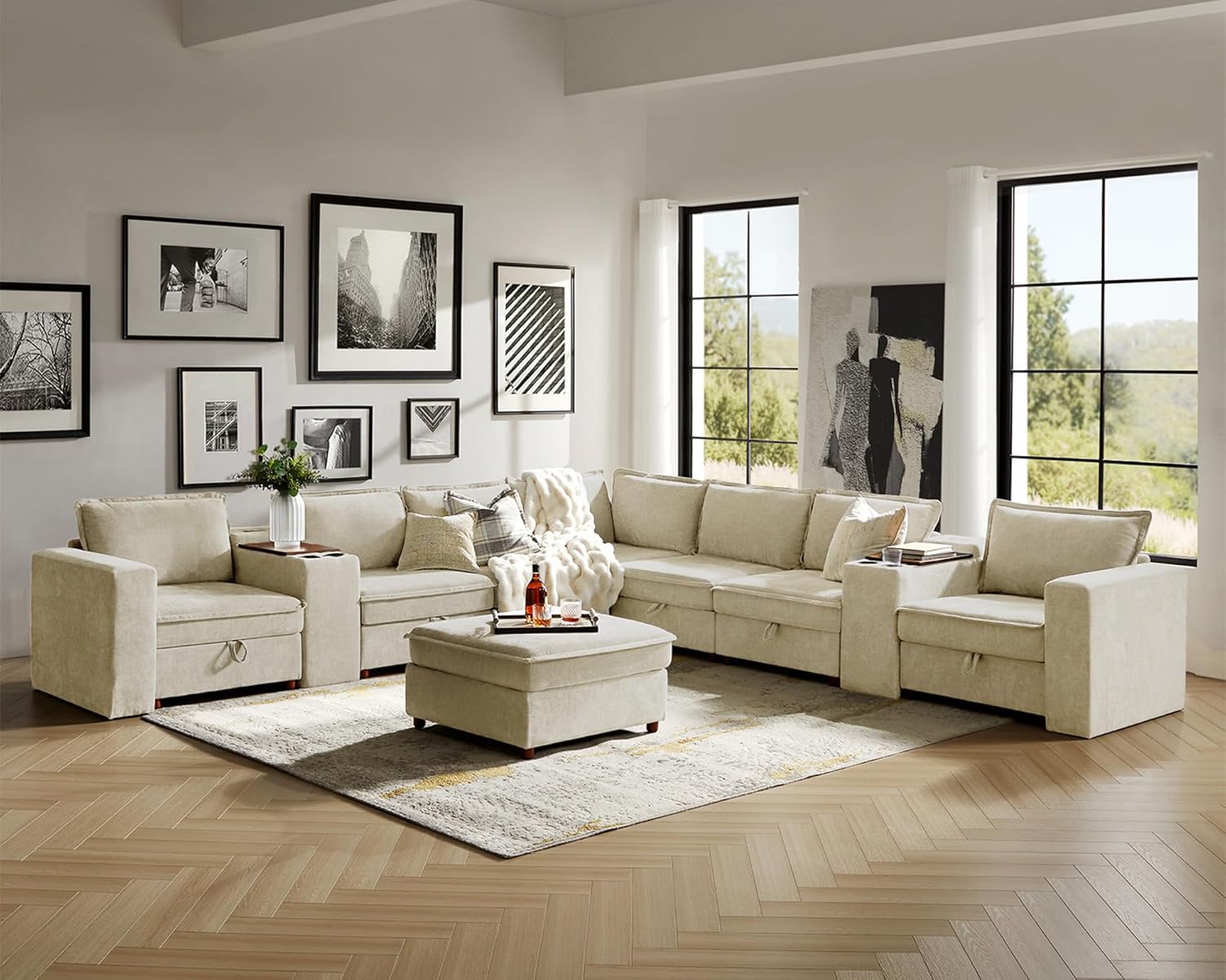 Along with its color versatility, the sofa’s modular design enhances visual balance and functionality in different layouts. Its oversized L shape fills spacious rooms with a comfortable,lounge-worthy appeal,while the multi-functional central unit with storage and USB ports blends form with practicality. For a quick reference, here’s how the beige tone integrates into popular styles: