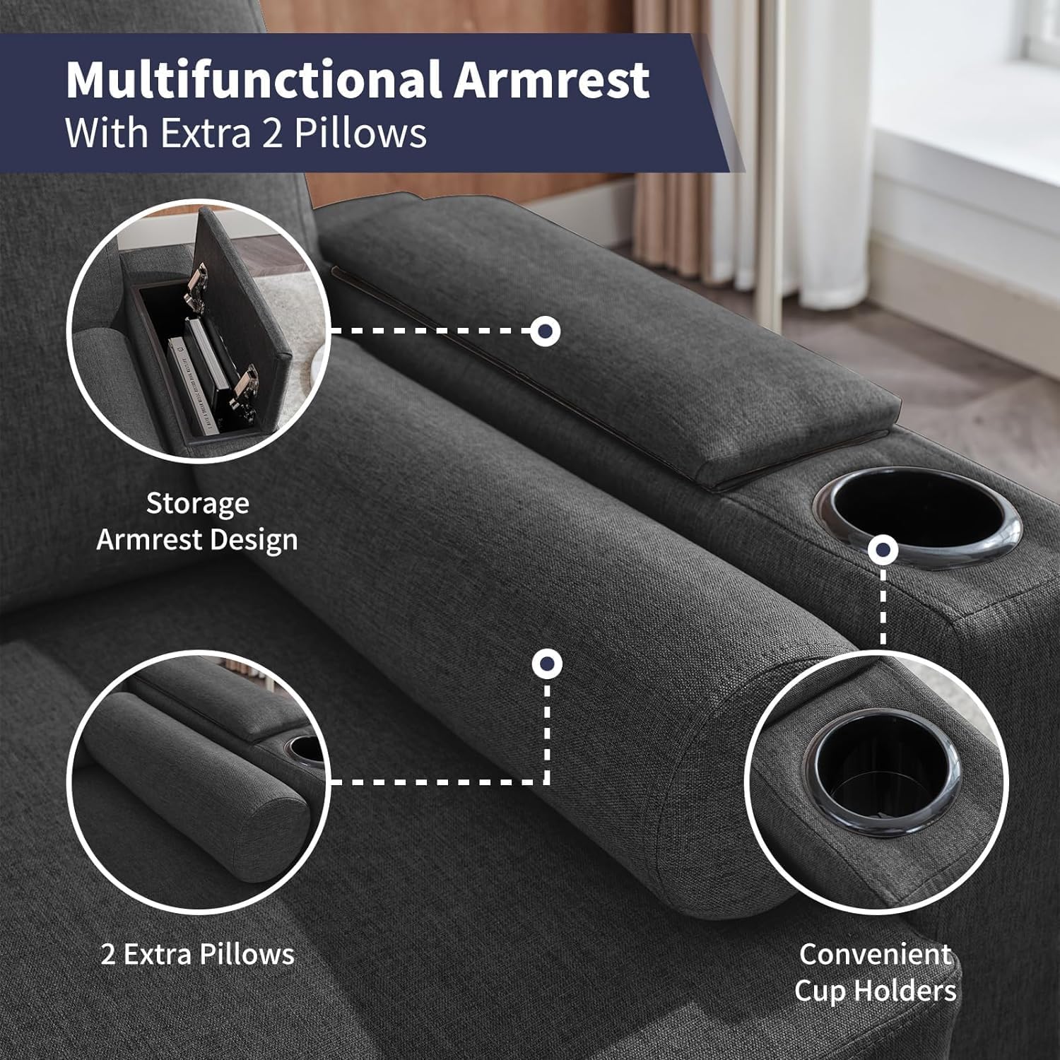 We recommend this set for anyone looking to maximize both comfort and functionality without sacrificing style.The dark grey linen fabric is durable and neutral enough to blend with various decor themes, appealing especially to those who appreciate a modern yet cozy ambiance. Thanks to built-in cup holders and plush pillows, it’s also a great fit for entertainers who want guests to feel relaxed and cared for. Whether installing it in a family room, entertainment lounge, or even a spacious office, this sofa lends itself to countless scenarios where comfort meets smart design.