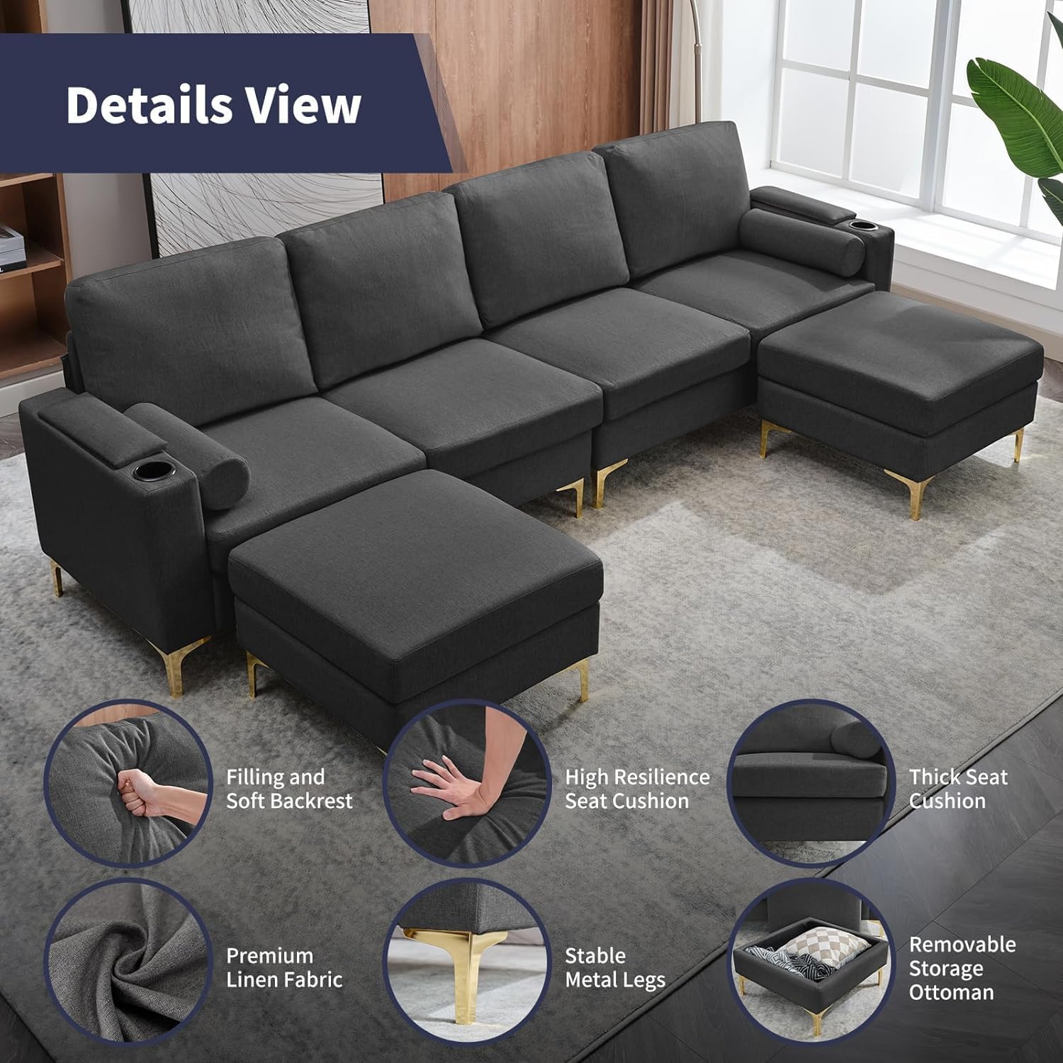 After spending considerable time with this sectional, we can confidently say the build quality holds up well under daily use. The sturdy frame and high-density foam cushions provide long-lasting support without sagging, which makes it ideal for active households. The linen fabric not only adds a refined texture but also resists wear and tear better than expected, maintaining its fresh dark grey tone after multiple cleanings. The modular design is a standout feature, allowing us to customize the seating arrangement effortlessly to fit our living space and needs.Additionally,the movable storage ottomans and storage armrest offer practical,hidden compartments that help keep our space clutter-free.