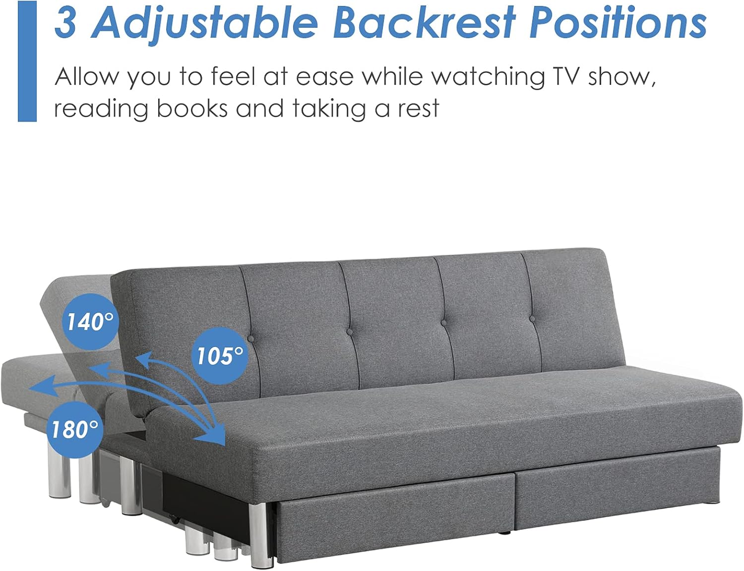 After spending considerable time with this sofa sleeper, we appreciate its versatility and comfort. The three adjustable backrest angles (105°, 140°, and 180°) let us easily switch between sitting, lounging, and sleeping positions, adapting perfectly to different activities like reading, watching TV, or hosting overnight guests. The ergonomic design supports our back, waist, hips, and legs, which significantly enhances relaxation. The skin-friendly linen fabric combined with high-density sponge cushions provides a cozy and breathable experience throughout the day. Additionally, the two large drawers with smooth wheels underneath are a fantastic space-saving solution – we use them to store blankets and pillows, and they slide out effortlessly for quick cleaning underneath.