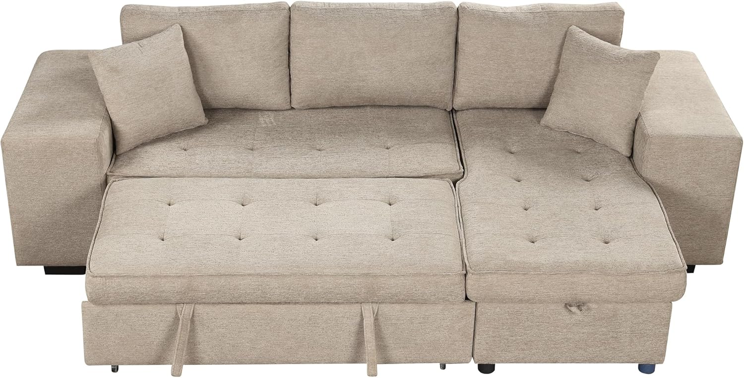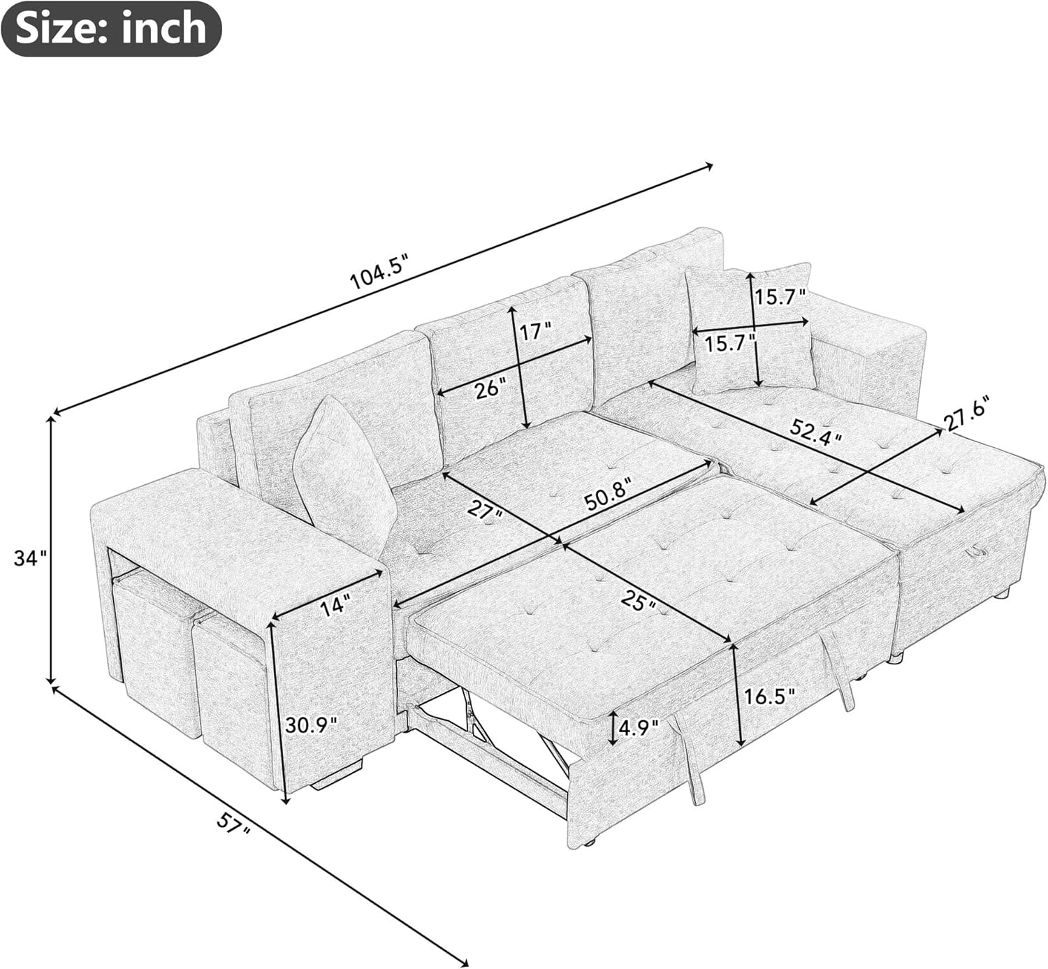 Daily use has proven this set to be extremely practical and comfortable. The pull-out sleeper mechanism is surprisingly user-friendly, aided by a portable handle and smooth pulley system, transforming the sofa into a bed without any hassle.The generous seating width and seat depth provide ample room for relaxation, while the 16.5-inch seat height strikes a nice balance for sitting and getting up with ease. Storage space within the chaise has become our go-to spot for blankets and magazines, helping keep the living room tidy. The two versatile stools fit well anywhere and add extra seating or footrest options, complementing our day-to-day living beautifully.