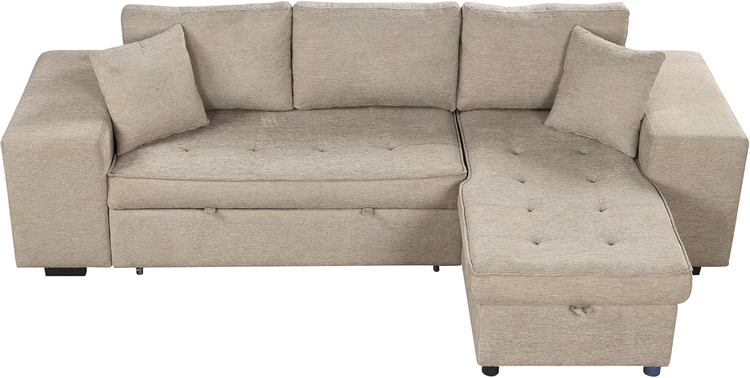 After spending time with this versatile living room set, we appreciate how it balances style, comfort, and functionality.The convertible design fits well into various room layouts,thanks to the reversible chaise and two additional stools that can be positioned as desired. The soft linen chenille upholstery feels inviting, providing a slightly fluffy and skin-friendly texture that makes lounging a pleasure. The built-in storage under the chaise proves incredibly practical, offering a discreet place to keep blankets, pillows, or other essentials without compromising space or aesthetics. Additionally, the pull-out sleeper mechanism is smooth and intuitive, making it a reliable option for accommodating overnight guests with ease.