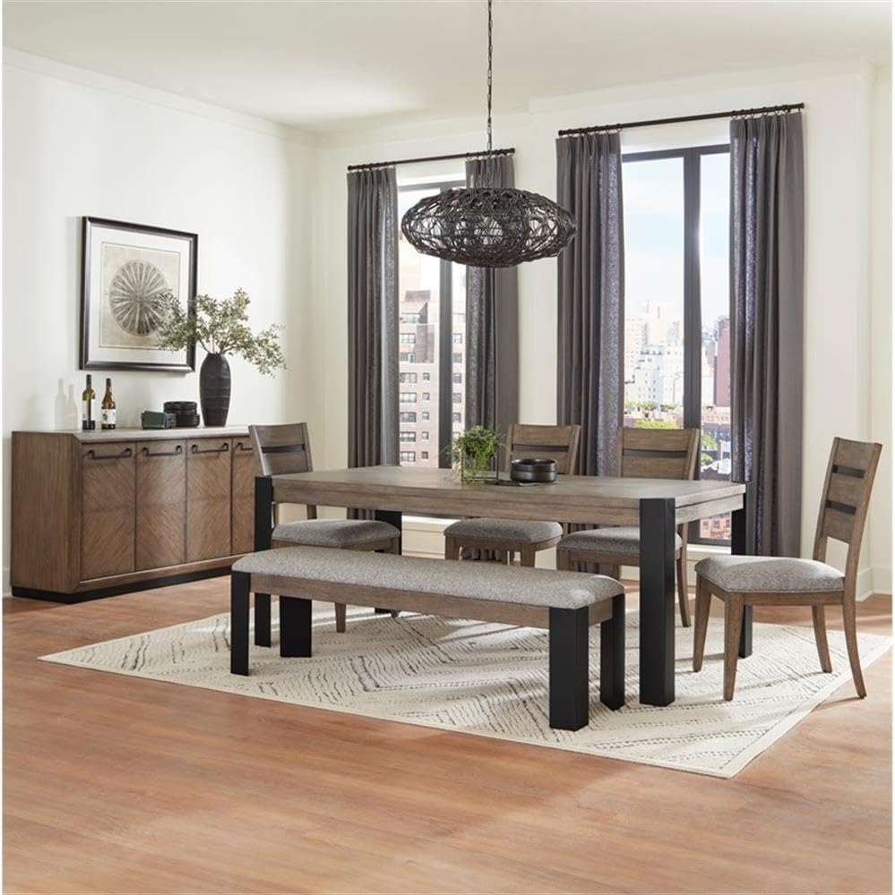 With its smooth smoked Arabica finish and textured neutral fabric upholstery, this bench effortlessly bridges the gap between modern and customary dining aesthetics.The clean lines and geometric legs introduce a subtle contemporary flair, making it a versatile addition that complements everything from rustic farmhouse tables to sleek, minimalist setups. Its transitional styling means it can seamlessly blend into eclectic decor, adding warmth without overpowering existing elements.