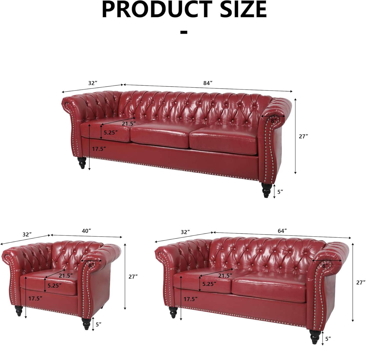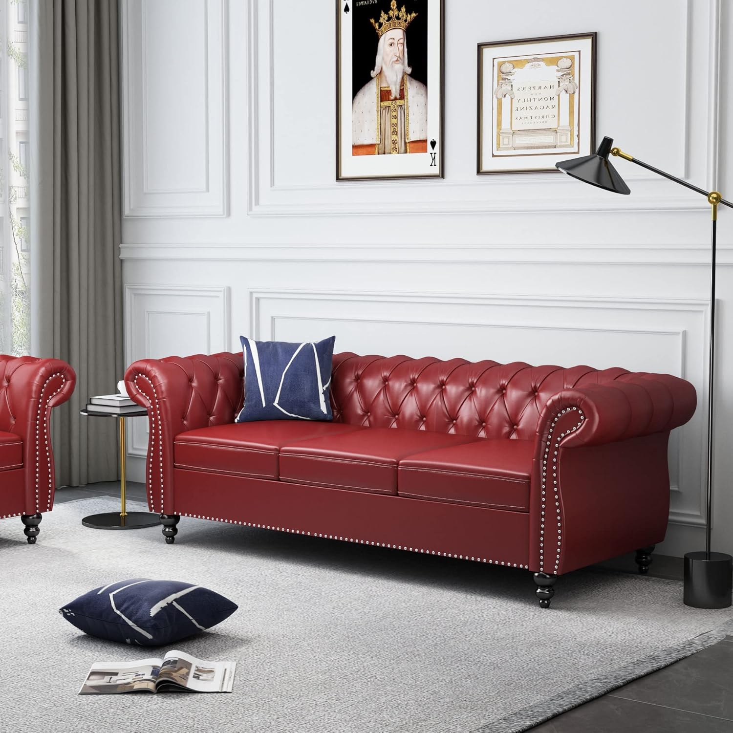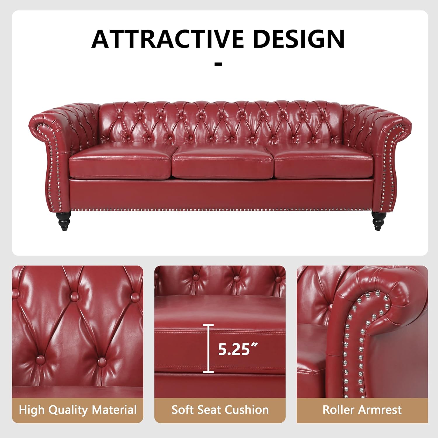 With its classic Chesterfield silhouette and rich burgundy leather upholstery, this sofa effortlessly adapts to a broad spectrum of interior styles. Whether your space leans toward traditional elegance or embraces modern minimalism, the deep tufted back and tasteful nailhead accents provide a refined focal point. The rolled armrests outlined with individually applied nailheads add a handcrafted charm, perfectly complementing vintage, industrial, or even eclectic decor themes. Its sturdy birch wood legs with non-slip feet also contribute a subtle natural element that grounds the piece, making it a versatile addition to any living room, bedroom, or office.