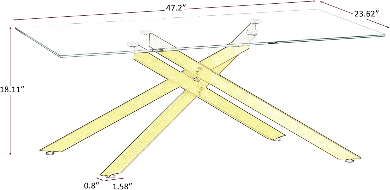 This sleek center table perfectly balances form and function with its tempered glass tabletop and striking X-shaped gold base.The combination of transparent glass and metallic accents offers a contemporary aesthetic that effortlessly integrates into modern living rooms or cozy café spaces. Its compact dimensions of 47.2in x 23.62in x 17.71in make it an ideal choice for both bustling apartments and spacious family rooms, providing versatility without overwhelming the area.
