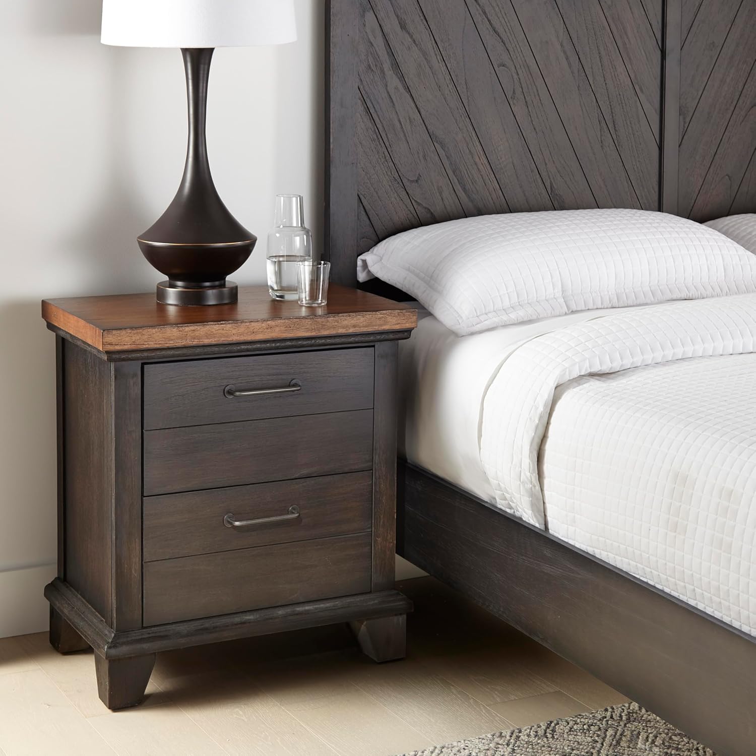 After spending some time with this nightstand, we appreciate how its rustic farmhouse charm blends effortlessly into a variety of bedroom décors. The combination of a rich chocolate finish and honey-stained tops gives it a warm, inviting feel that doesn’t overpower the space. Functionality is just as impressive, with two ultra-deep drawers that provide ample storage for bedside essentials. The smooth side drawer glides make it easy to access your items, ensuring convenience without compromising on style. The planked-effect fronts add a subtle texture, enhancing the piece’s handcrafted look.