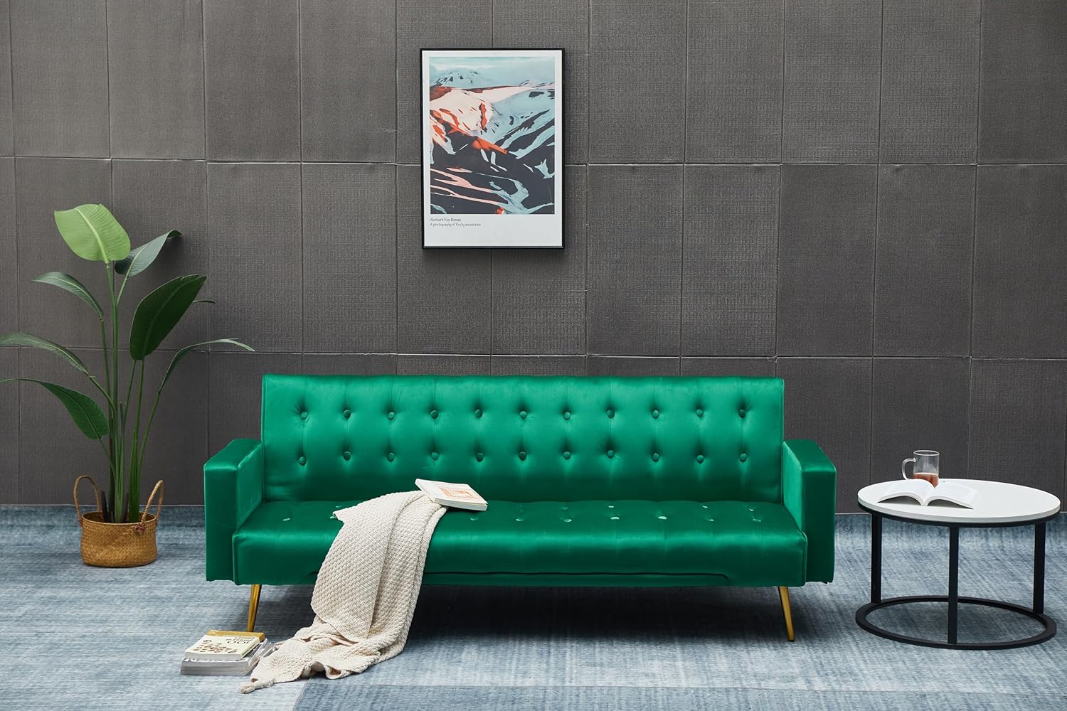 the 75.2″ Luxurious Velvet upholstery Couch with its tufted buttoned design,versatile adjustable back,and striking gold metal legs truly stands out as a multi-functional piece that blends style and practicality. Whether you need a sophisticated seating area for your living room or a comfy bed for unexpected guests, this modern futon sofa bed adapts seamlessly to your space and needs. From its plush velvet fabric to the elegant tufting and sturdy frame, it’s clear this sofa bed is designed to elevate both comfort and aesthetics.