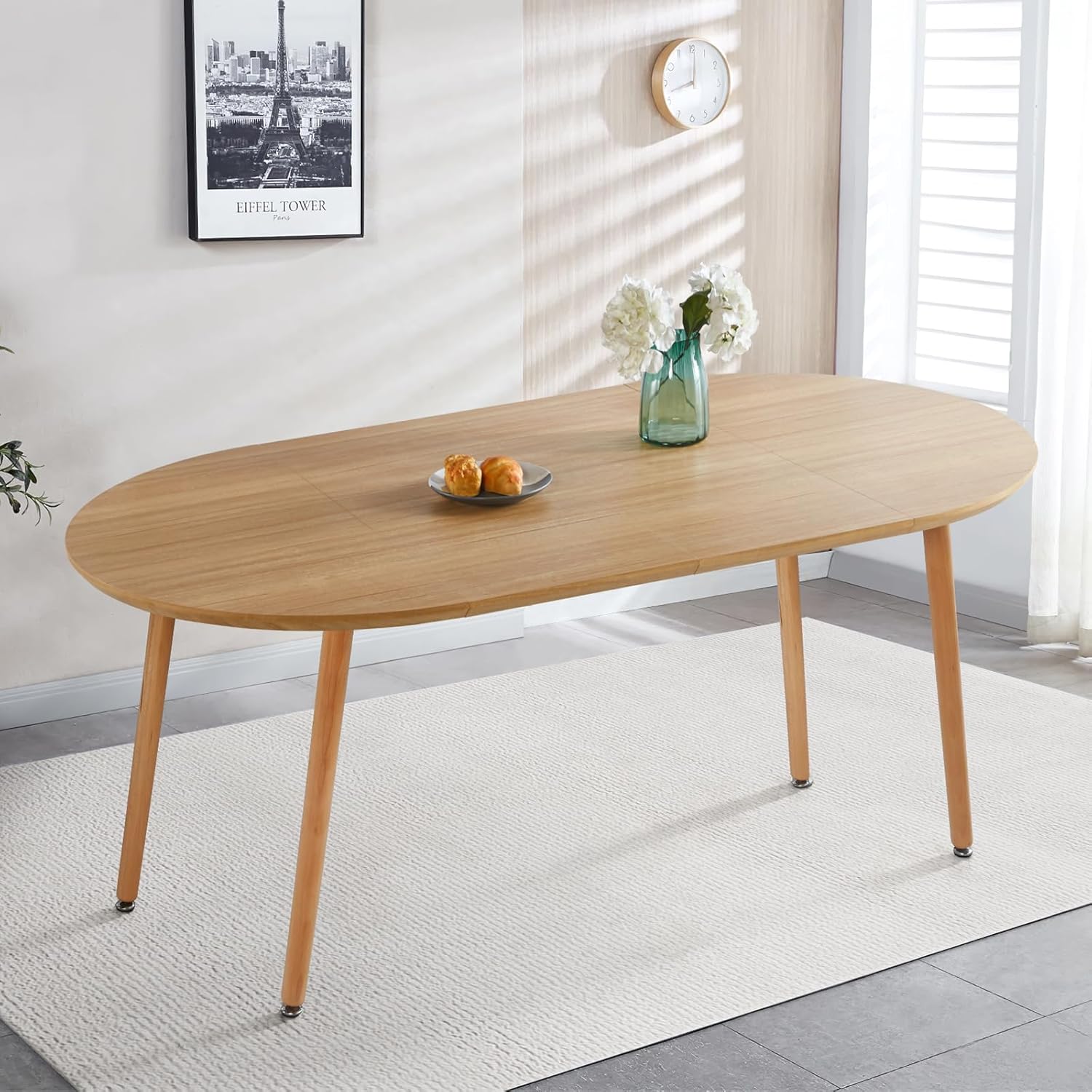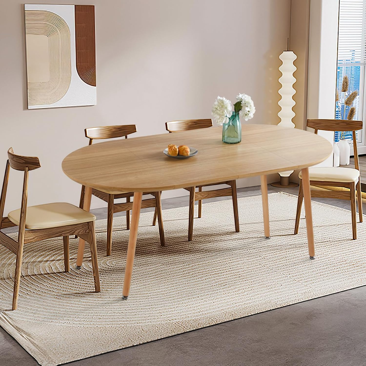 We appreciate how the table’s clean lines and natural wood finish bring both warmth and sophistication to contemporary spaces. Its versatile design complements a wide range of décor themes, including boho, mid-century modern, and minimalist interiors. the gentle oval shape when extended adds a soft, organic touch, ensuring the table doesn’t overpower the room but rather enhances it with subtle elegance. The natural wood tone pairs perfectly with neutral palettes, soft pastels, or bold accent colors, making it an excellent centerpiece for living rooms, kitchens, or even home offices.