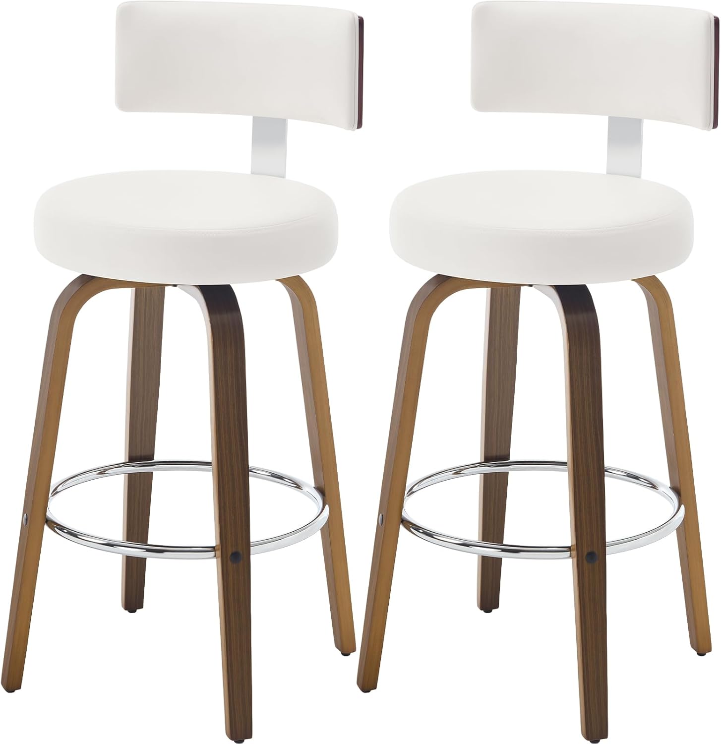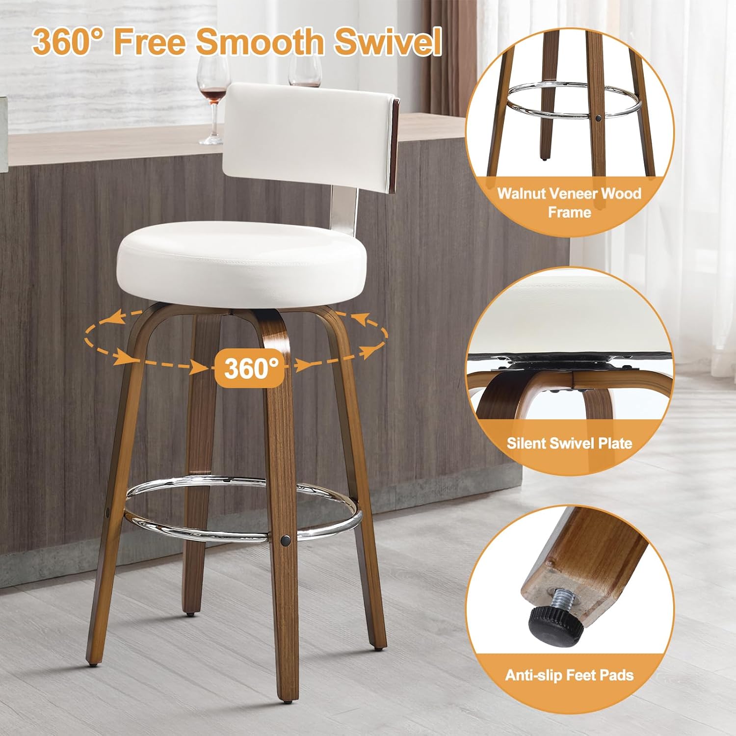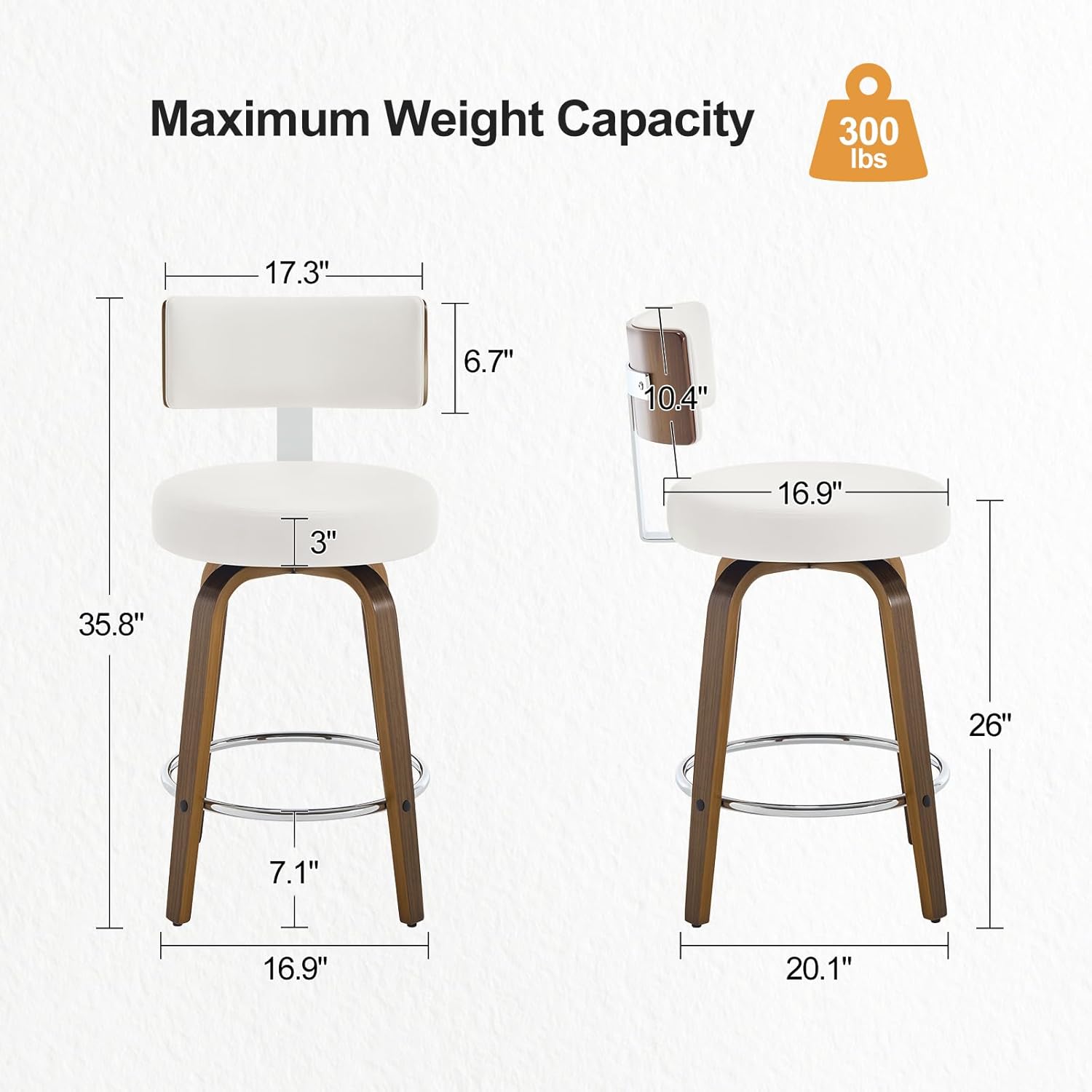 After several weeks of daily use, the durability of these stools truly stands out. The high-elastic sponge padding in the seat maintains its plush comfort without sagging, while the white faux leather upholstery shows no signs of cracking or discoloration. the 360° swivel mechanism operates smoothly without any creaks or resistance, indicating solid craftsmanship. The walnut wood legs, made from FSC-certified materials, have endured bumps and minor scuffs with minimal wear, maintaining their elegant mid-century tone. these stools have held up exceptionally well, combining sturdy construction with ergonomic design that supports our backs and hips through long conversations or meal prep.