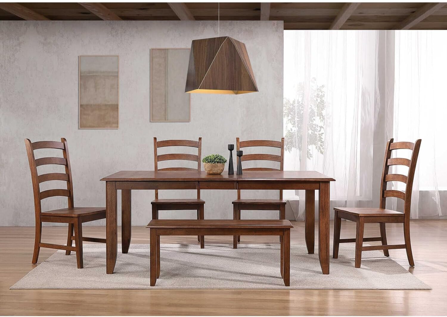 The versatile designs of the slat-back chairs and bench lend themselves well for both casual and formal settings. whether placed in a quaint lakeside cabin or a modern urban loft, it provides functional seating and style. Here’s a quick guide showing how the set aligns with popular décor styles: