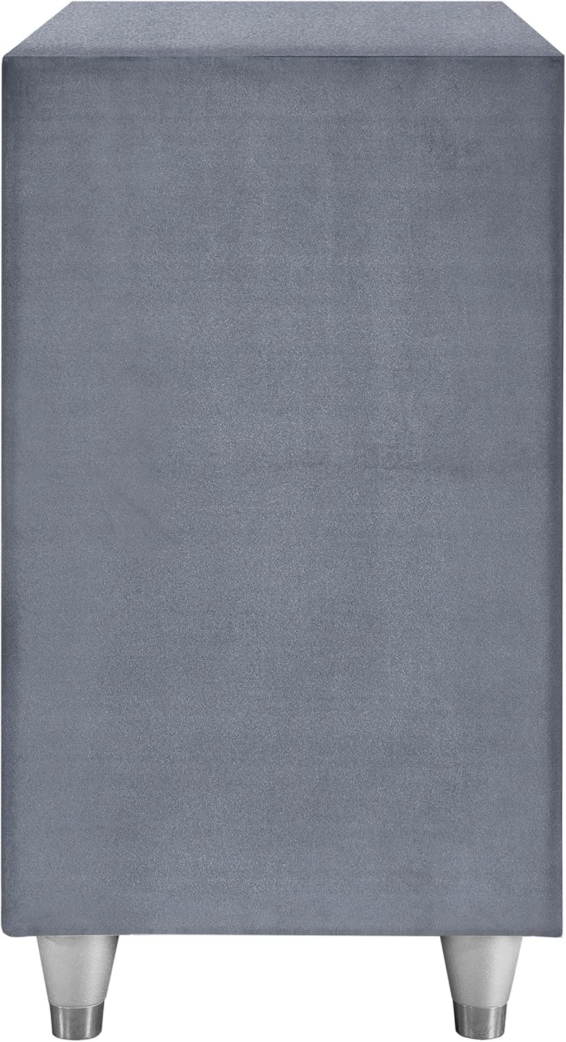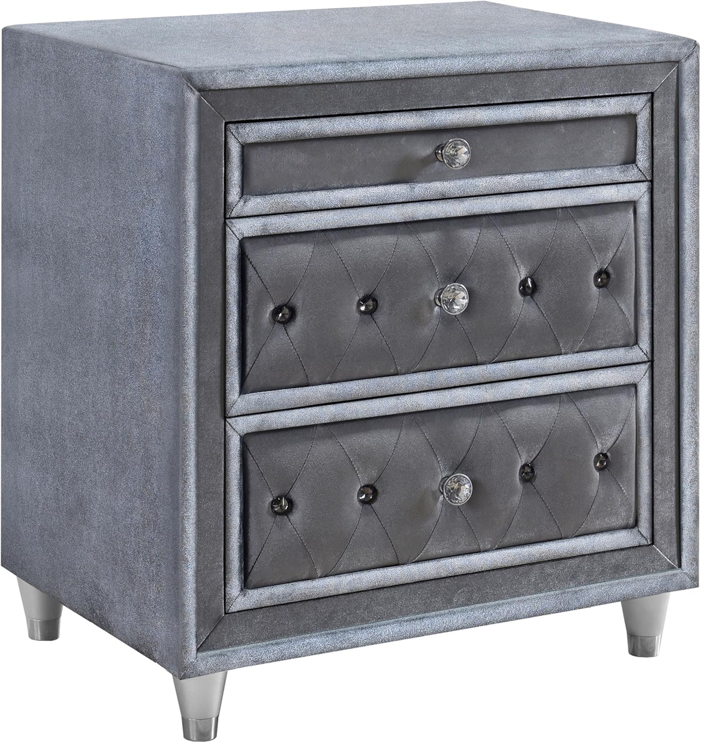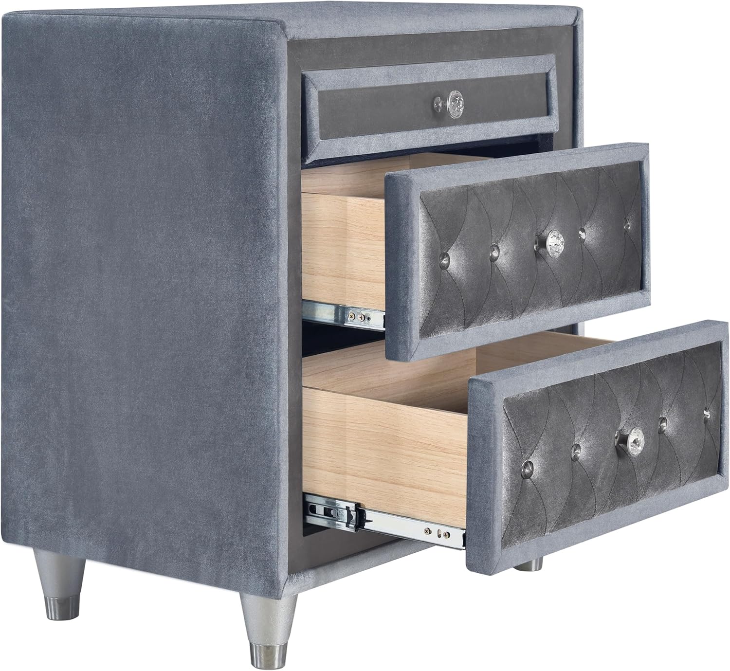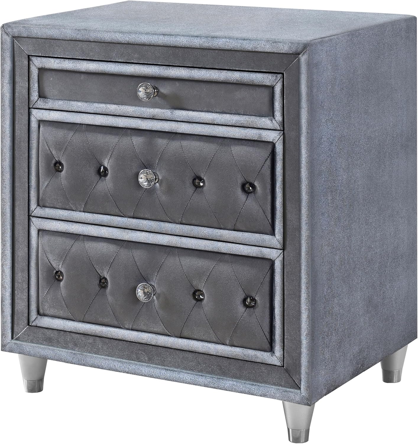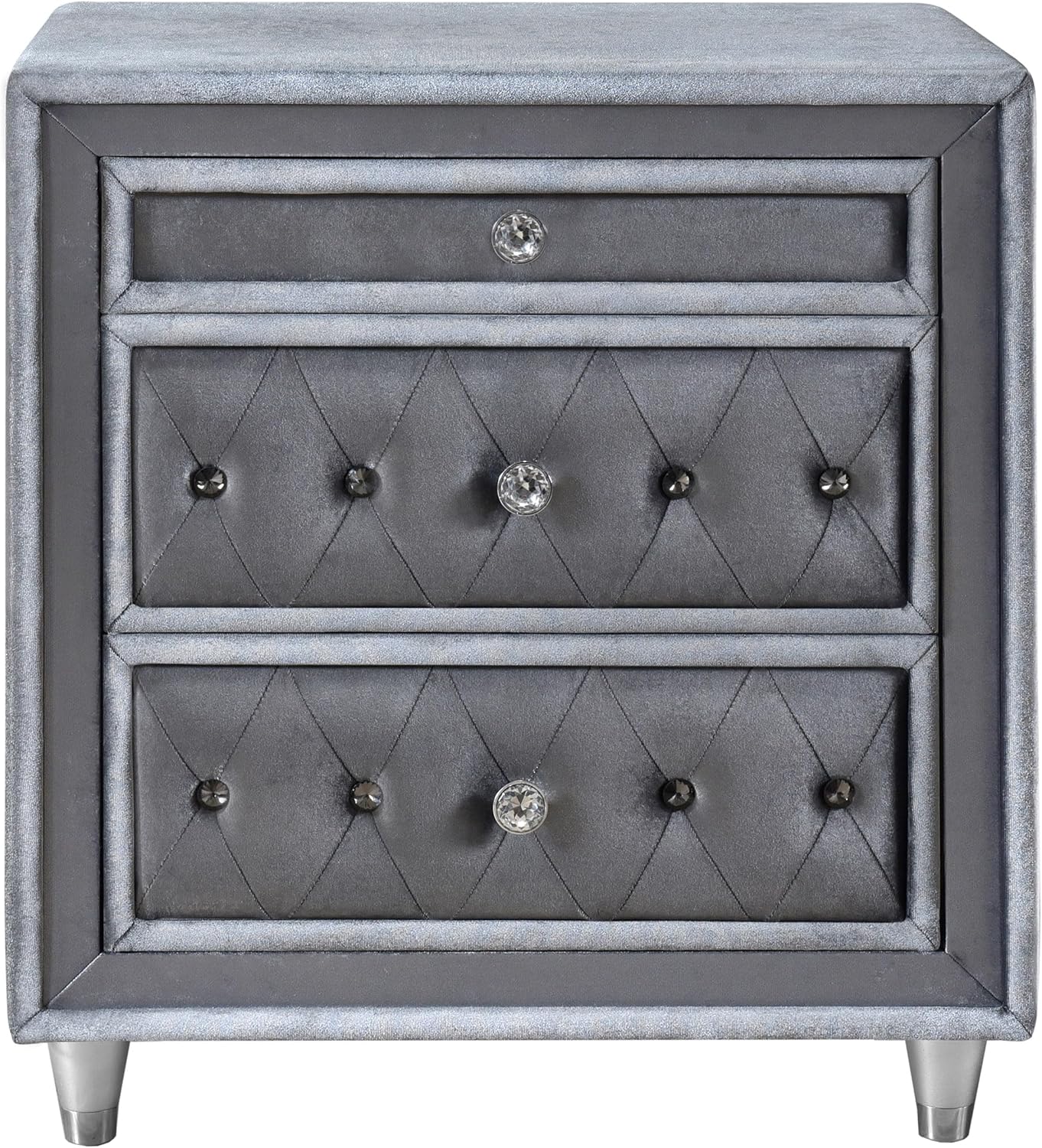 We appreciate how this nightstand strikes a gorgeous balance between traditional glamour and contemporary style. The soft gray velvet upholstery provides a luxurious tactile experience while maintaining a subtle sophistication that complements a wide range of bedroom decors. The drawer fronts showcase elegant button tufting and crystal-like knobs that catch the light, infusing a touch of classic sparkle without overwhelming the overall modern aesthetic. This thoughtful combination of textures and finishes transforms a simple storage piece into a statement of refined elegance.