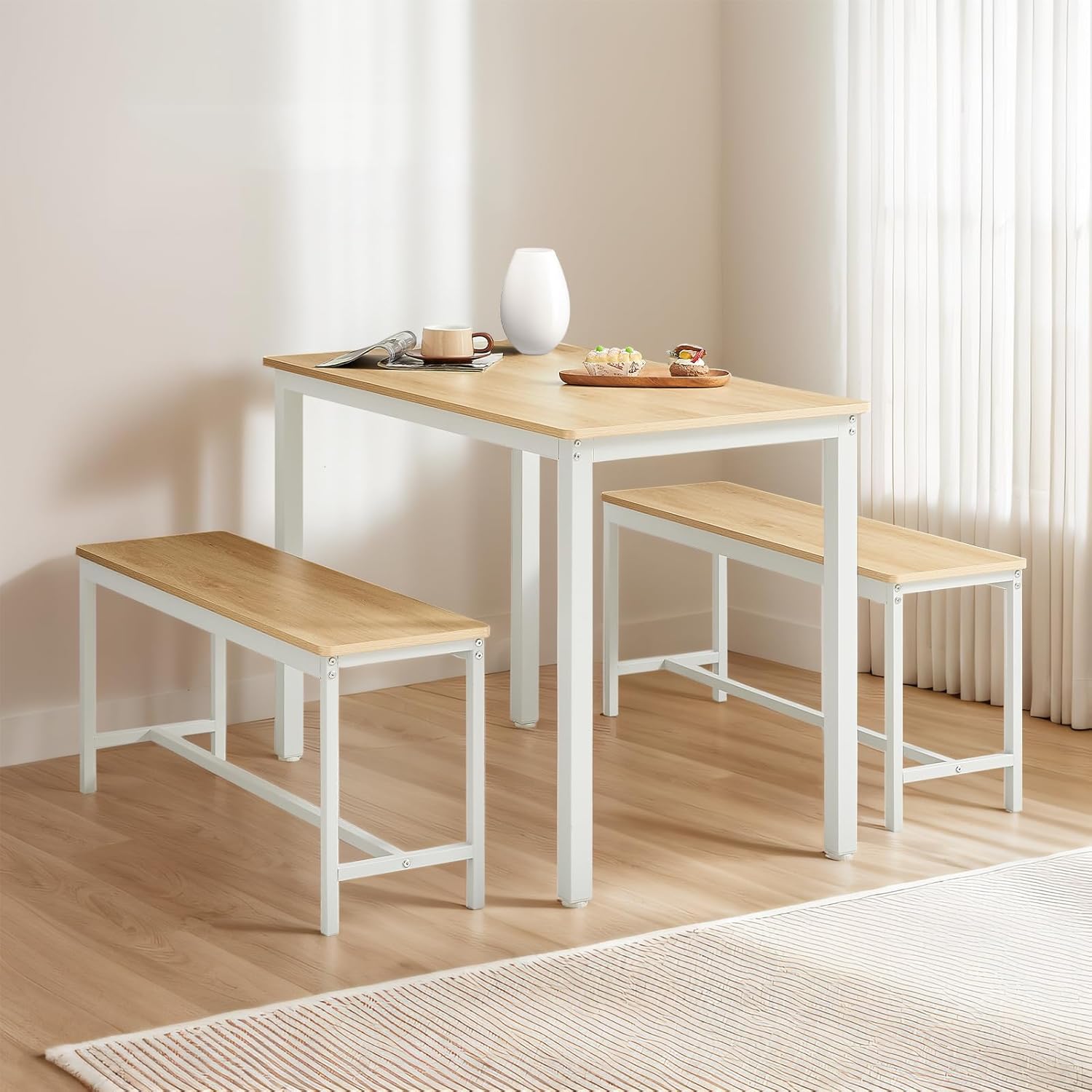 This dining set is a brilliant choice for anyone juggling limited space without wanting to sacrifice style or functionality. Its compact design, featuring two benches that neatly slide under the table, makes it a smart solution for apartments, small kitchens, or cozy breakfast nooks. the blend of industrial metal framing with a warm, rustic tabletop creates a versatile aesthetic that complements both modern and farmhouse-inspired interiors. Beyond looks, it offers impressive durability with a sturdy steel frame supporting up to 260 pounds on the table and 400 pounds on each bench. This means it’s ready to handle daily family meals, casual hangouts, or even game nights with ease.