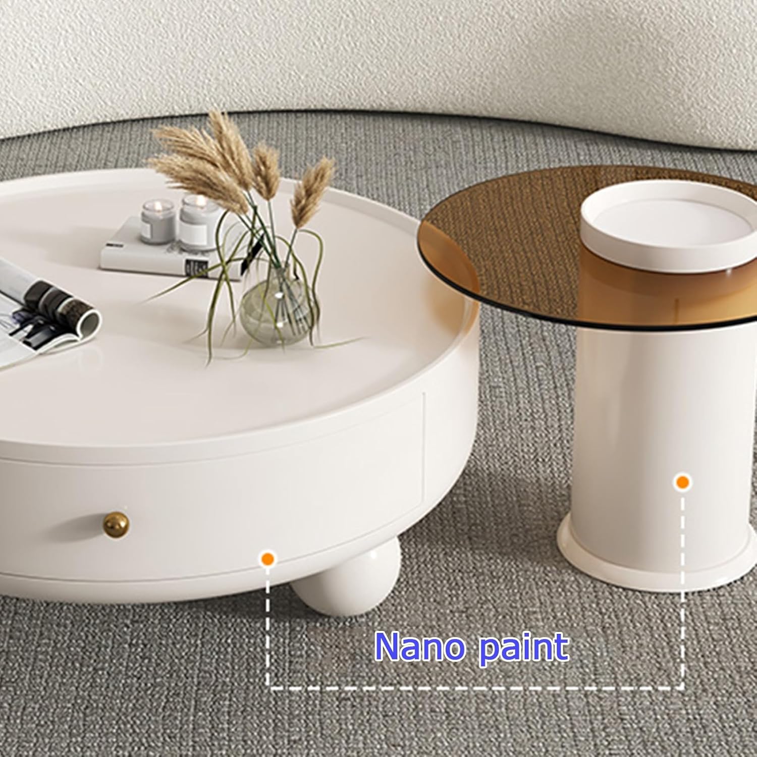 Beyond saving space, the nesting feature enhances practicality by allowing us to reposition the tables based on our immediate needs-whether as a chic coffee table duo, a bedside companion, or even a stylish plant stand.Their rounded corners and spherical base add a soft aesthetic while ensuring stability and safety, which is ideal for bustling households. The combination of a durable density board surface and easy-to-clean tempered glass makes maintenance stress-free, and the smooth opening drawers offer additional storage, keeping essentials out of sight but within reach.