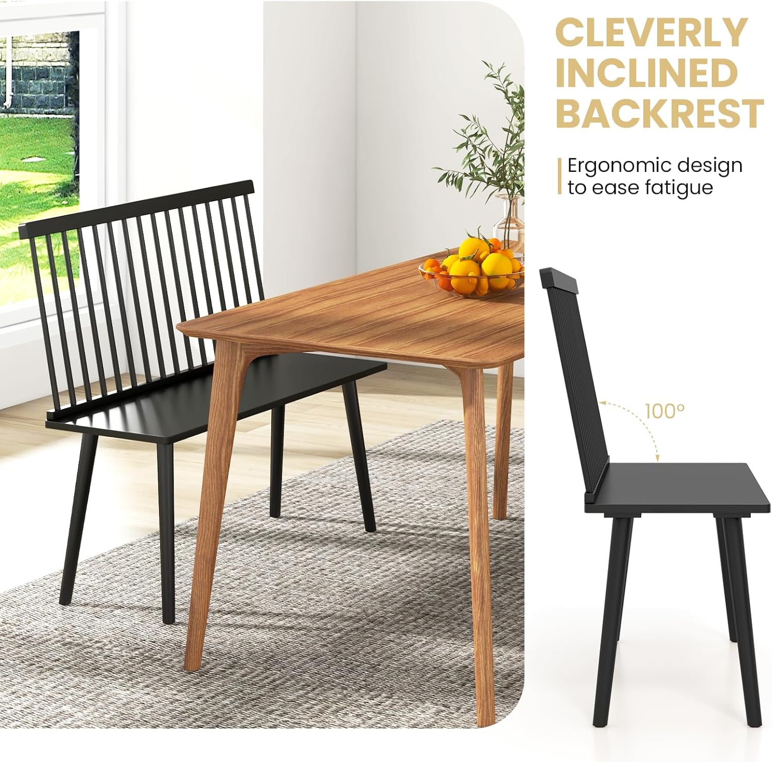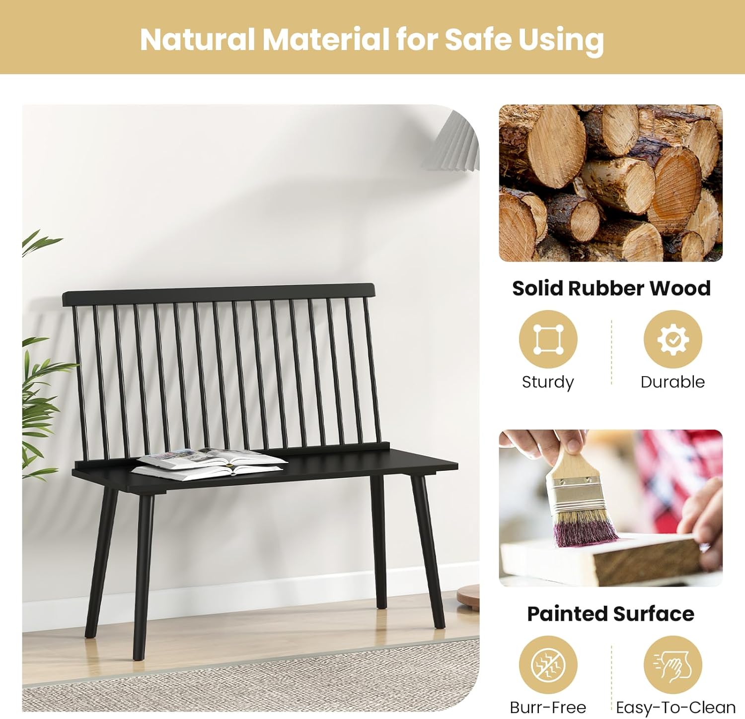 The classic Windsor spindle back shape endows this bench with a distinctive farmhouse elegance that effortlessly complements both conventional and modern interiors. Its gently curved spindle backrest, angled at a comfortable 100°, provides excellent lumbar support, inviting long, relaxed seating whether at the dining table or in a cozy entryway nook. The textured black finish enhances the natural rubber wood grain, adding depth and authenticity to its vintage-inspired silhouette. this combination of form and function captures the quintessential charm of timeless craftsmanship while serving modern household needs.