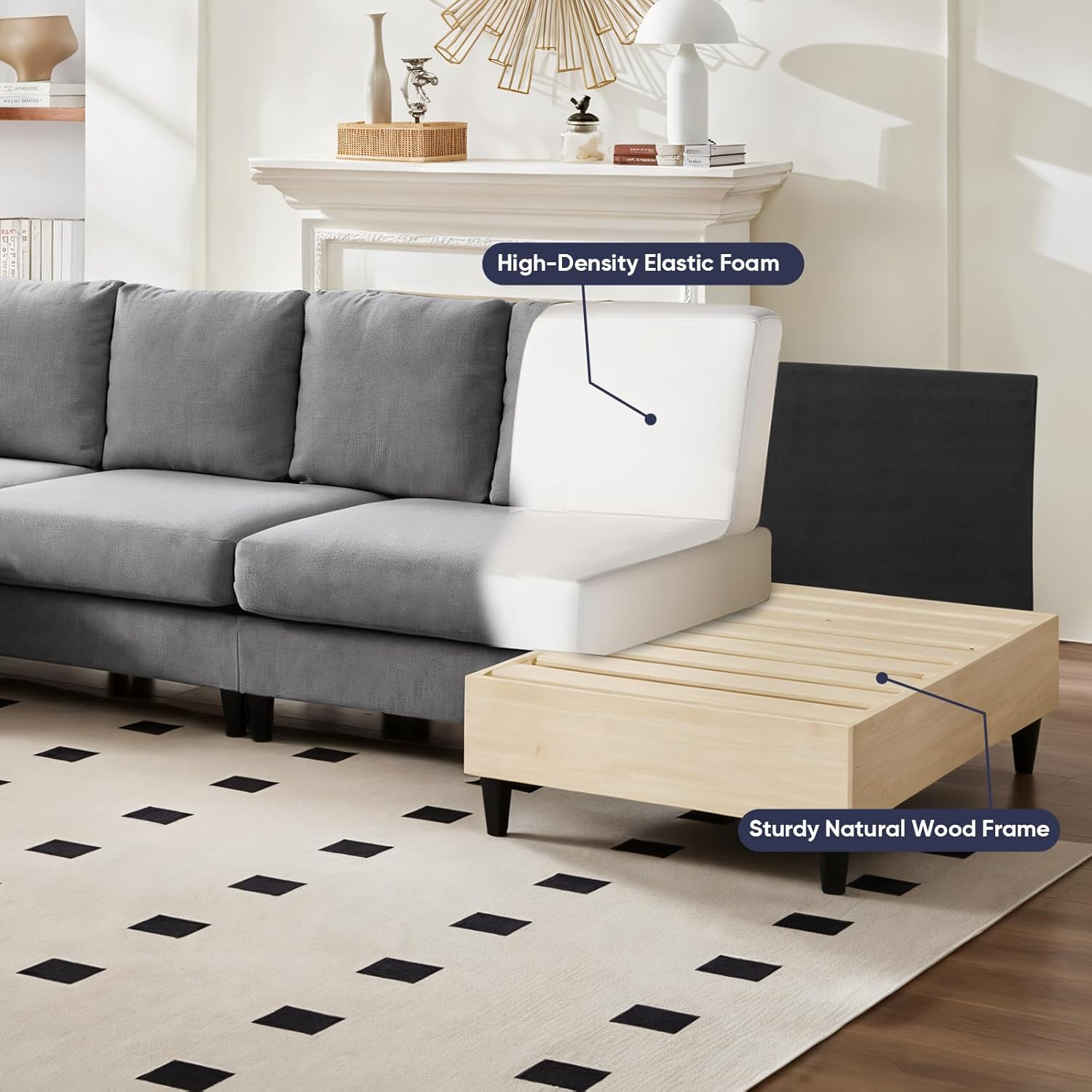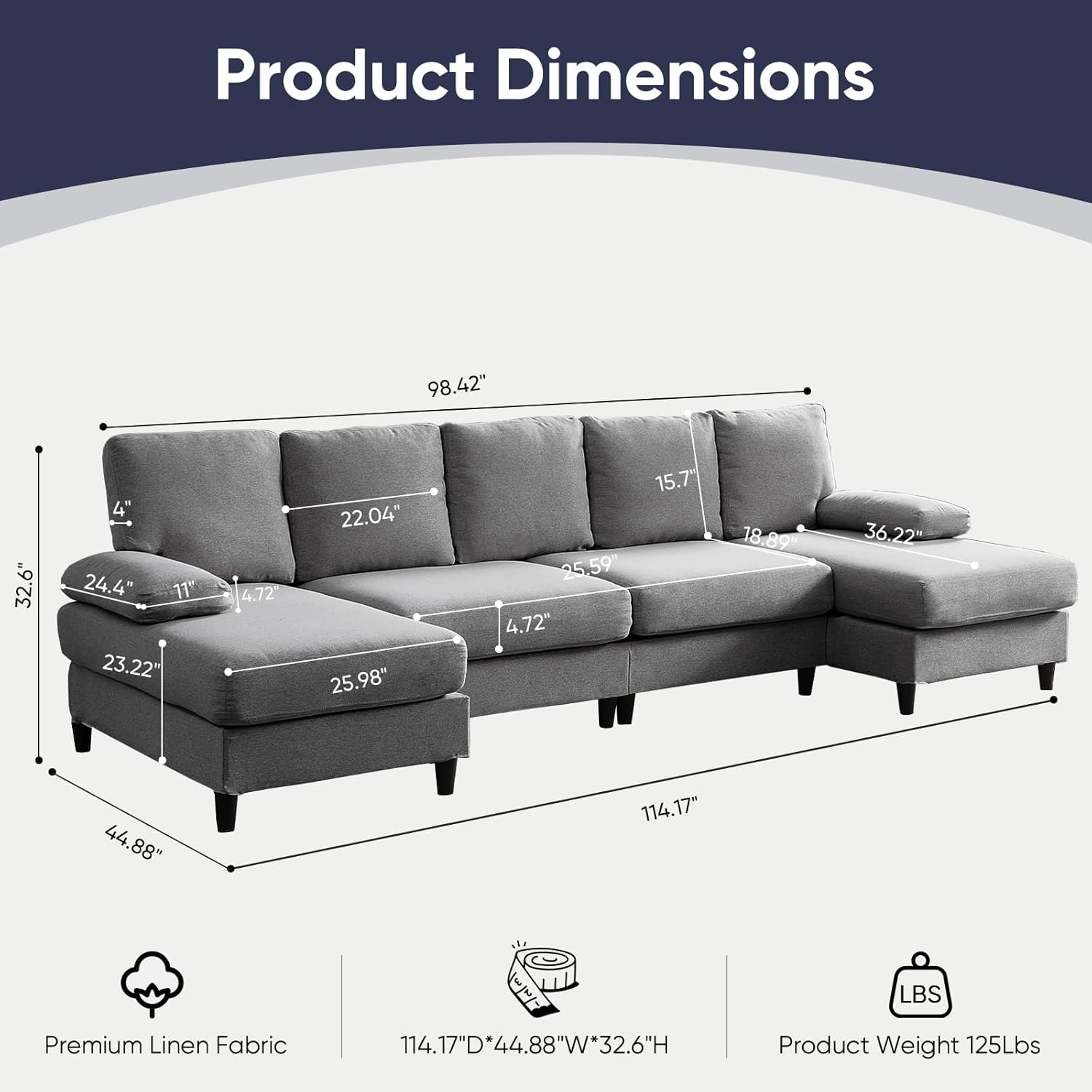 With dimensions of 114 inches in length and 45 inches in width, this sectional sofa strikes an excellent balance between comfort and space efficiency. Its U-shaped design, featuring double chaise lounges, is especially effective for maximizing seating without overwhelming the room. The fixed armrests and well-thought-out proportions make it a smart fit for both compact apartments and more spacious living rooms. The breathable linen fabric and cushioned seats filled with elastic sponge also add to its lightweight visual appeal, ensuring the sofa doesn’t dominate the space.