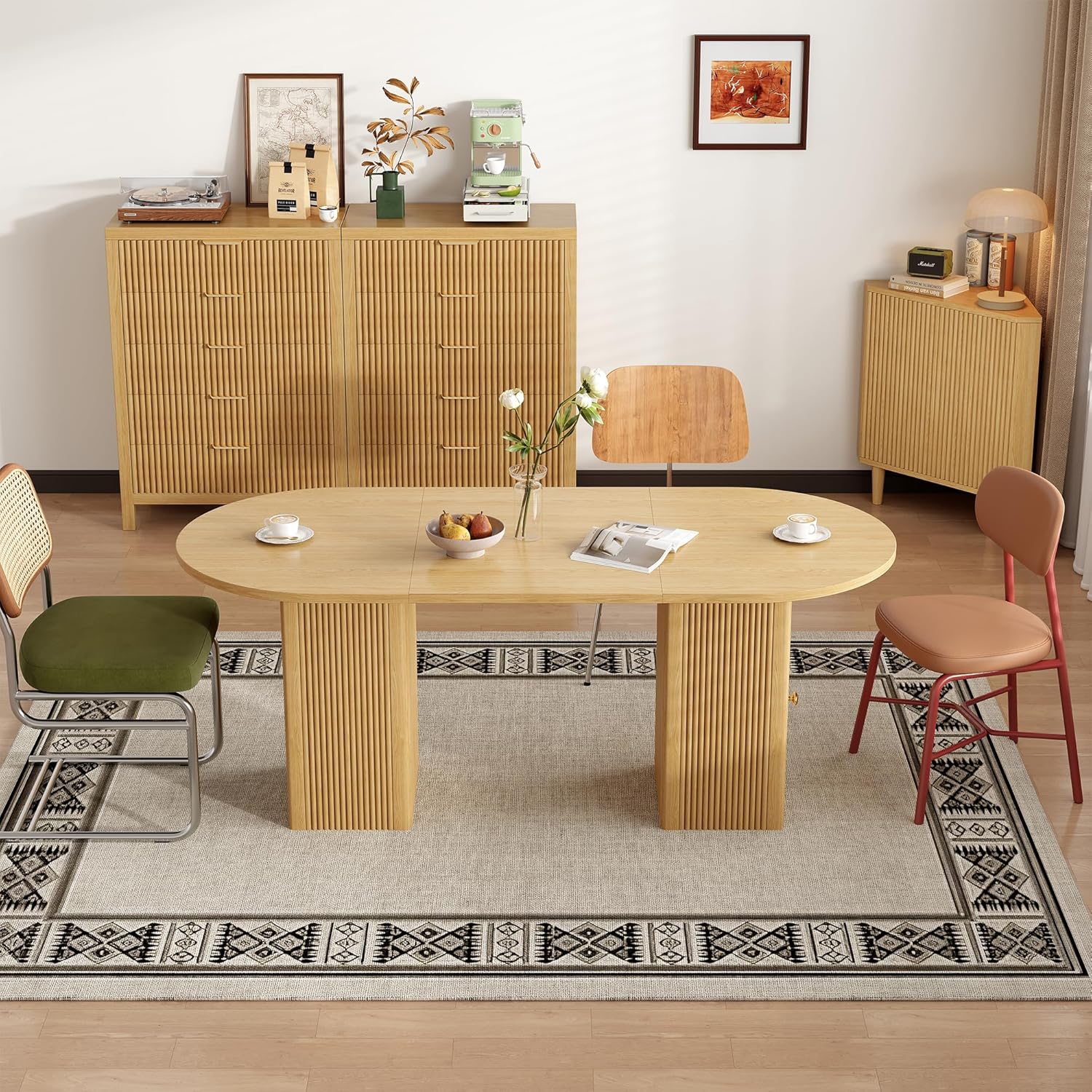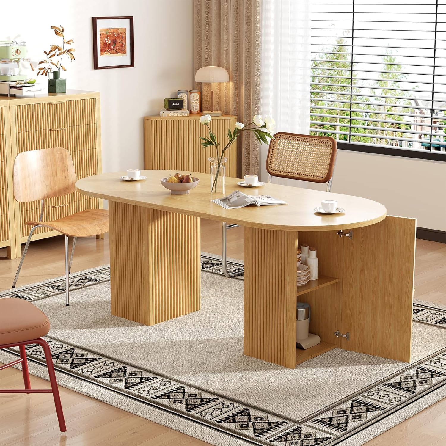 After spending time with this table, we appreciate its blend of style and functionality. The thick, sealed desktop not only resists scratches and spills but also ensures durability for everyday use. Its oval shape is both elegant and practical, providing ample room for families of four to six without overwhelming smaller spaces. The added bonus of a two-layer storage shelf keeps dining essentials close at hand, making it perfect for those who value both convenience and aesthetics.Whether you’re hosting dinner parties or need a versatile surface for casual meetings, this piece adapts seamlessly to many lifestyles.