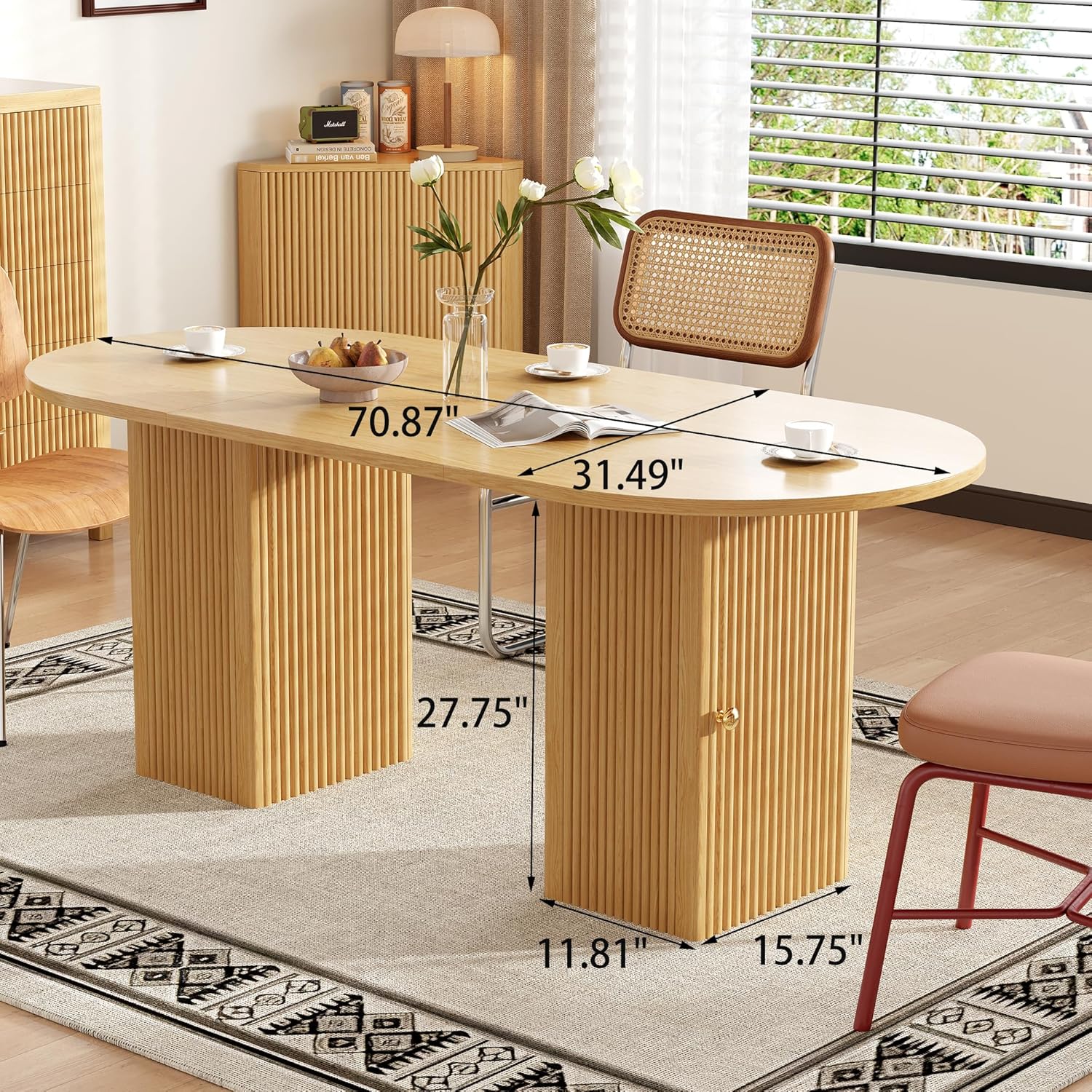 The storage shelf integrated into the base of this dining table adds a remarkable layer of functionality that complements its elegant design. With two spacious tiers, the shelf offers ample room to store dining essentials such as placemats, napkins, or serving trays, keeping everything organized and easily accessible during mealtime. This clever storage solution helps maintain a clutter-free tabletop, allowing us to fully enjoy the generous 70.87-inch surface without sacrificing convenience. The sturdy construction ensures the shelves hold up well under daily use, while the natural oak finish blends seamlessly with the tabletop for a cohesive aesthetic.