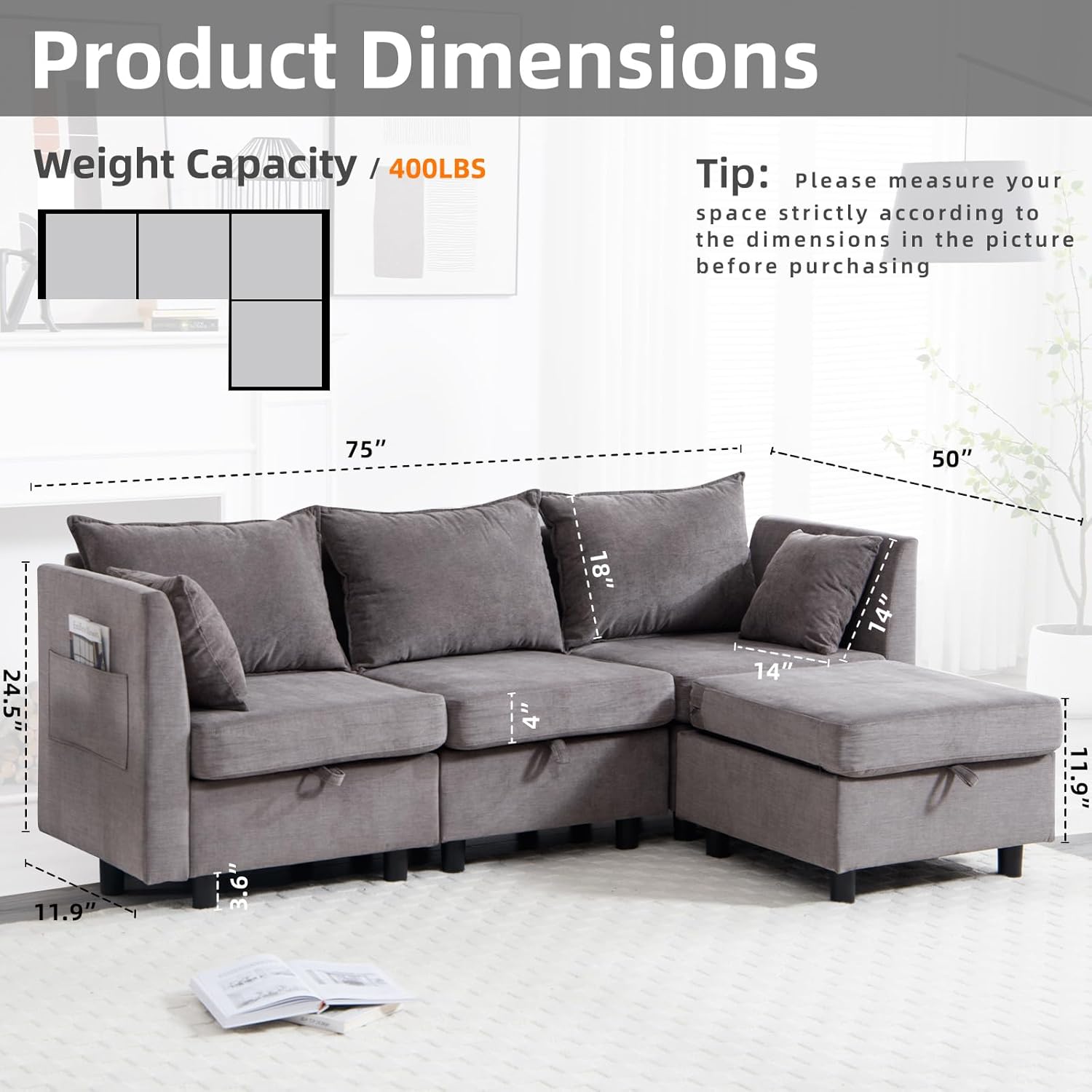 Stability is another strong suit of this couch-secured firmly with metal clips, each module stays securely in place no matter how you customize the layout. Its solid wood framework supports up to 400 lbs per seat, providing peace of mind during everyday use or when entertaining guests. Plus, the armrests feature handy side pockets to keep essentials within reach, adding thoughtful convenience to your comfort. Below the seats, generous storage compartments keep clutter out of sight, enhancing both relaxation and functionality without compromising the plush feel.