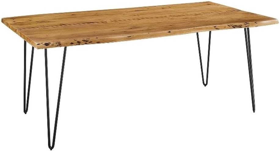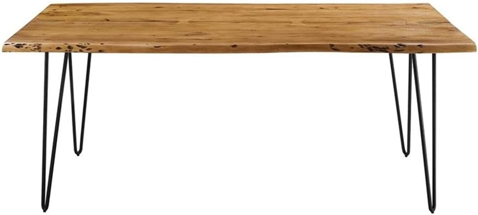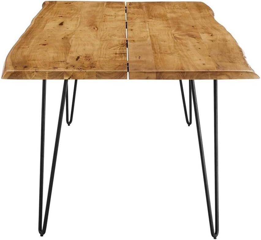 We find this dining table to be a stunning blend of natural craftsmanship and modern industrial design. Crafted from solid acacia wood, the surface features unique live edge detailing and butterfly joints that highlight the organic patterns and textures of the wood, ensuring no two tables are exactly alike. Its powder-coated metal hairpin legs not only provide sturdy support but also add a sleek, mid-century flair that complements a variety of interior styles, from contemporary to rustic.