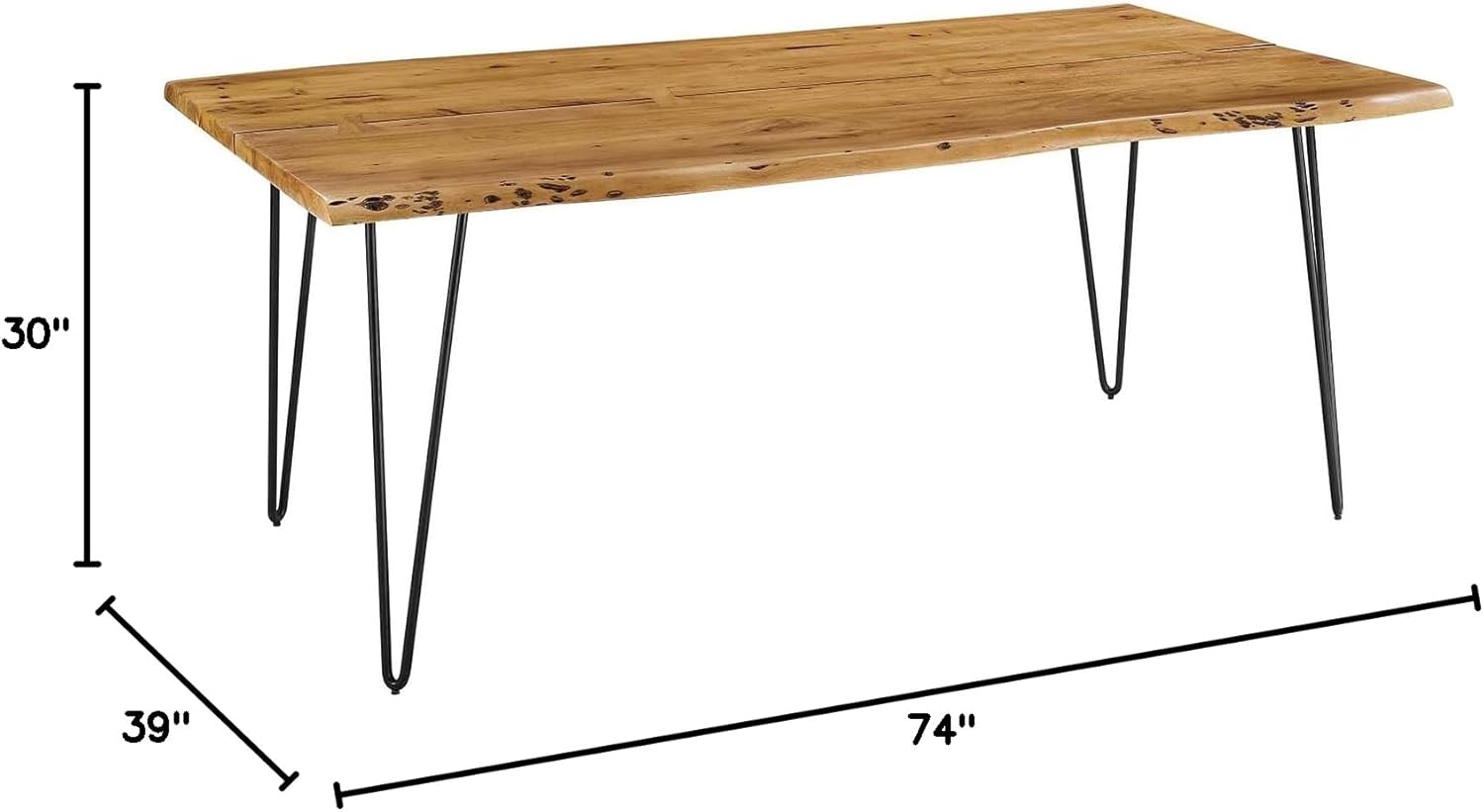 Measuring 74 inches in length and 39 inches in width, this dining table strikes a fine balance between considerable presence and functional size. Its dimensions make it spacious enough to comfortably seat six to eight people, which is ideal for family dinners or hosting small gatherings without feeling cramped.The width provides ample elbow room and surface space for dishes, laptops, or decorative accents, enhancing its everyday usability.Thanks to the thoughtful design-especially the hairpin legs that maximize legroom-this table adapts well in both dining rooms and open-plan living areas. Its height of 30 inches follows standard dining table ergonomics, ensuring comfortable seating arrangements for most chair styles.