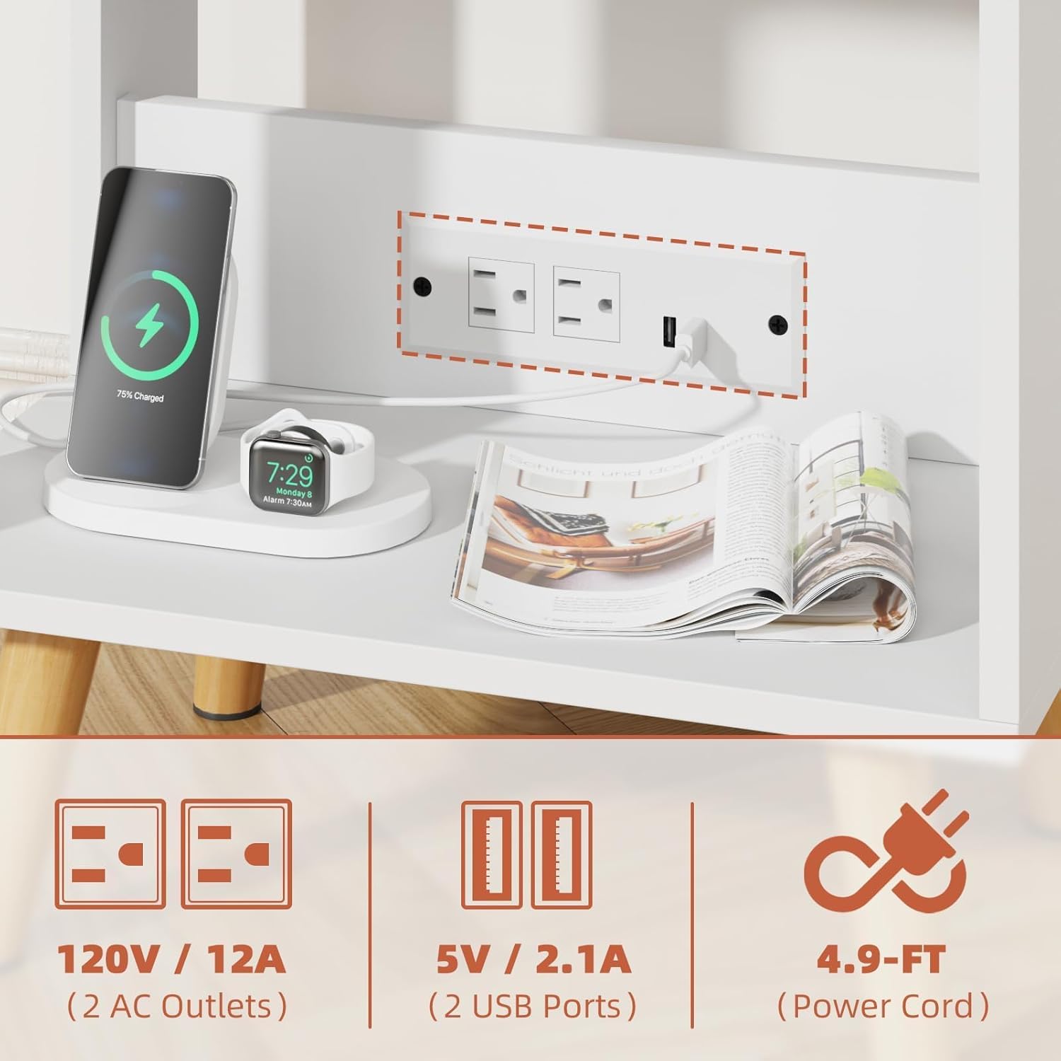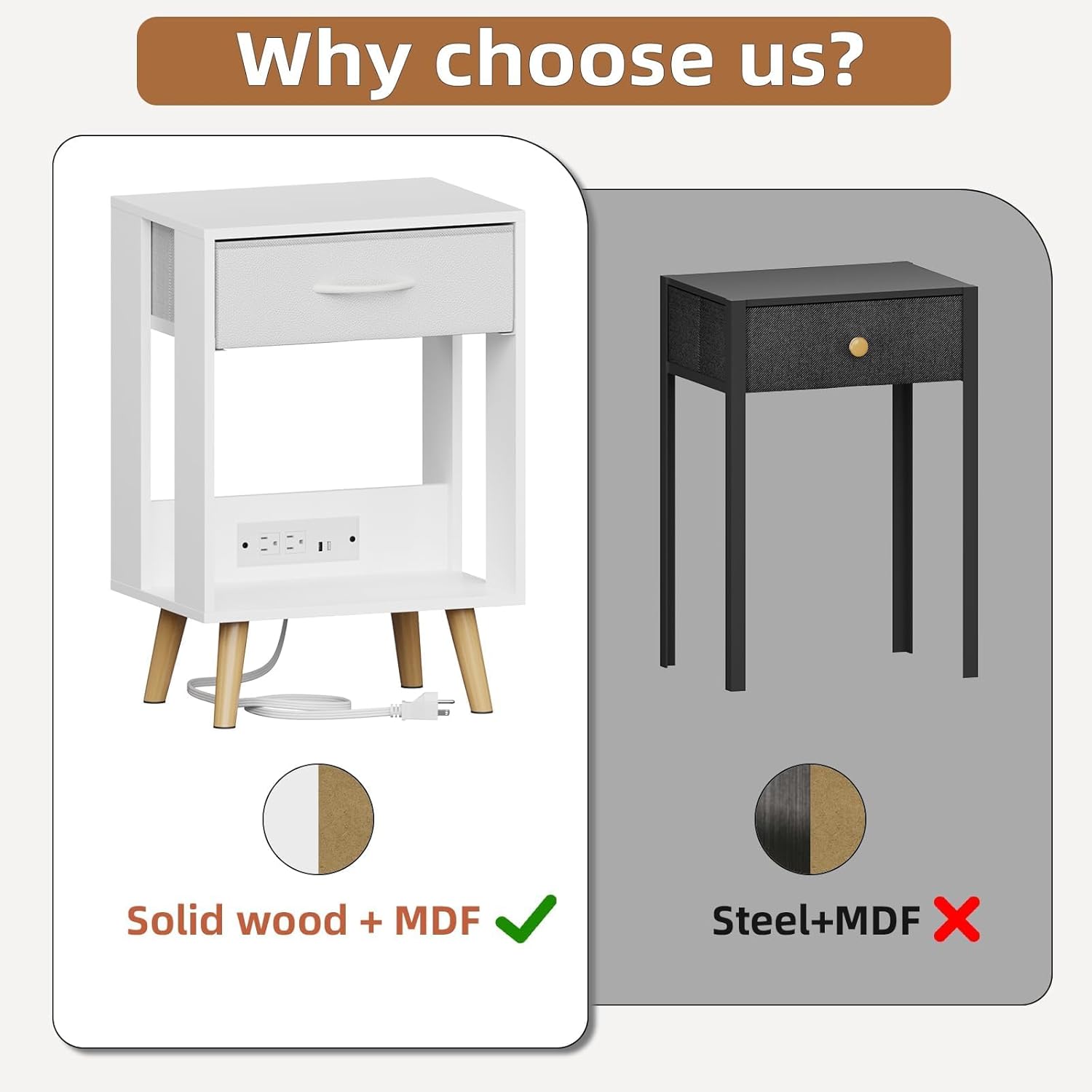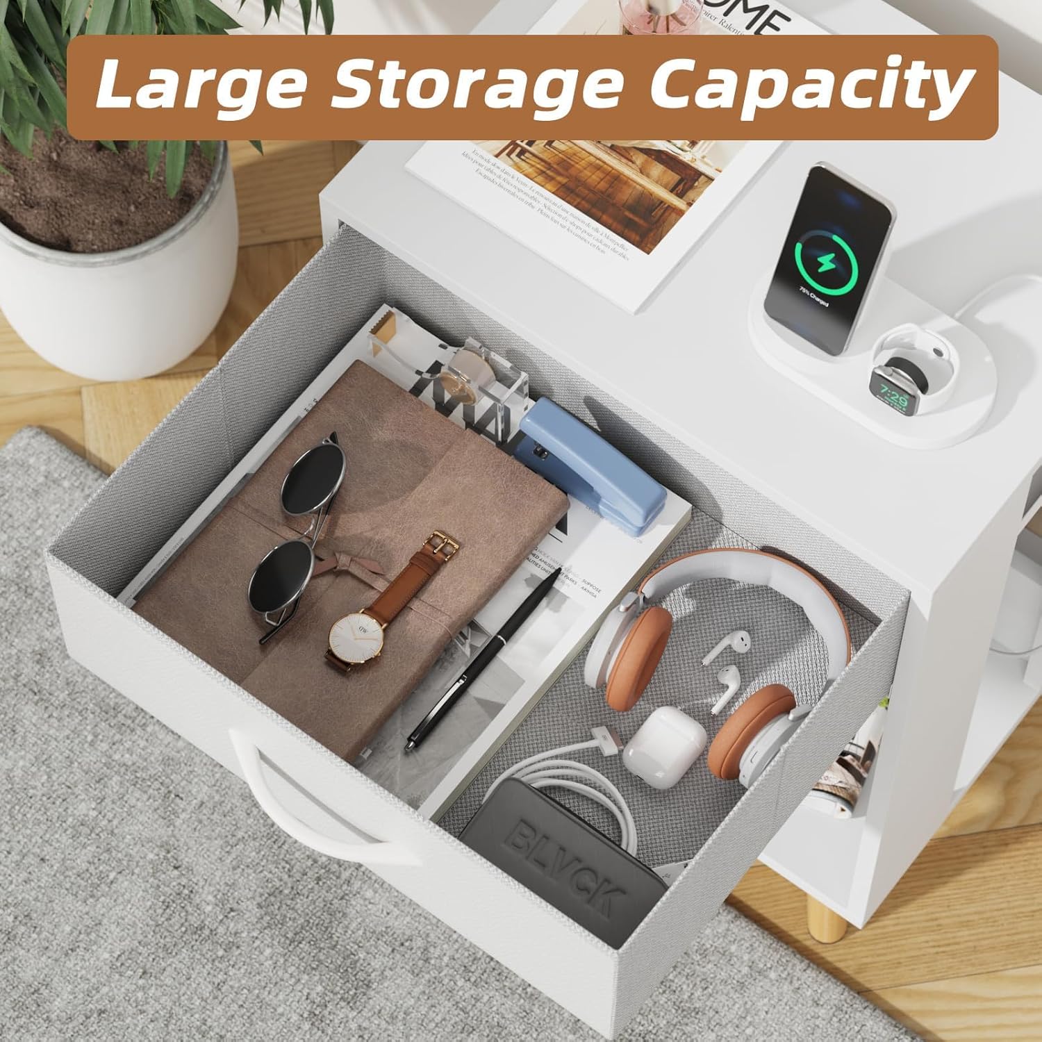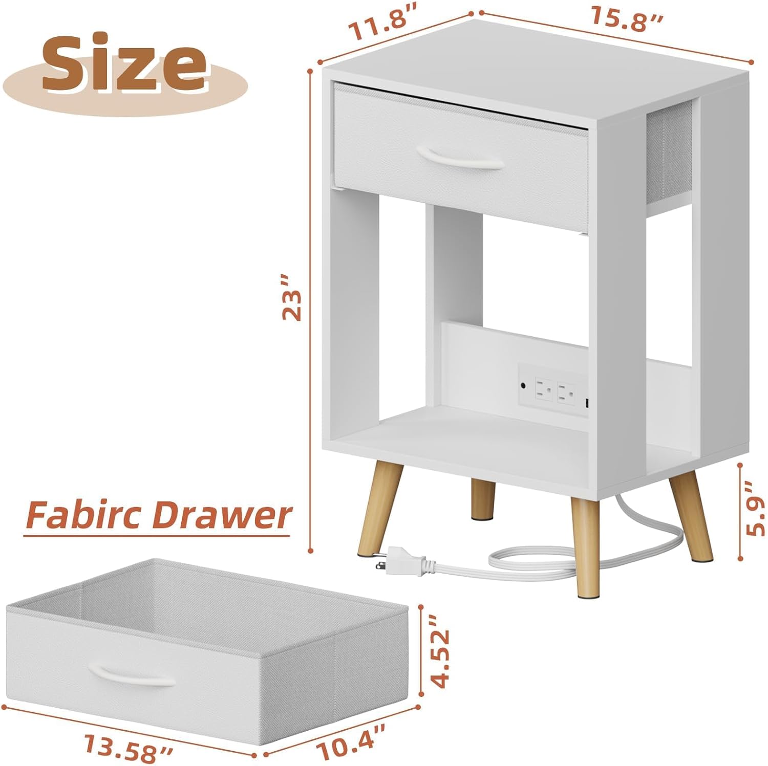 Our experience with this nightstand has been a blend of practicality and style that fits seamlessly into a variety of bedroom aesthetics. The clean white finish combined with the open wood shelf and fabric drawer creates a modern yet cozy look that adds personality without overwhelming the space. Assembly was straightforward and took us about 20-25 minutes, matching the advertised ease but also allowing some time to appreciate the thoughtful design details, like the integration of built-in power outlets and USB ports.These features enhance convenience, making it effortless to keep our devices charged and within reach, which is a welcome upgrade from conventional bedside tables.