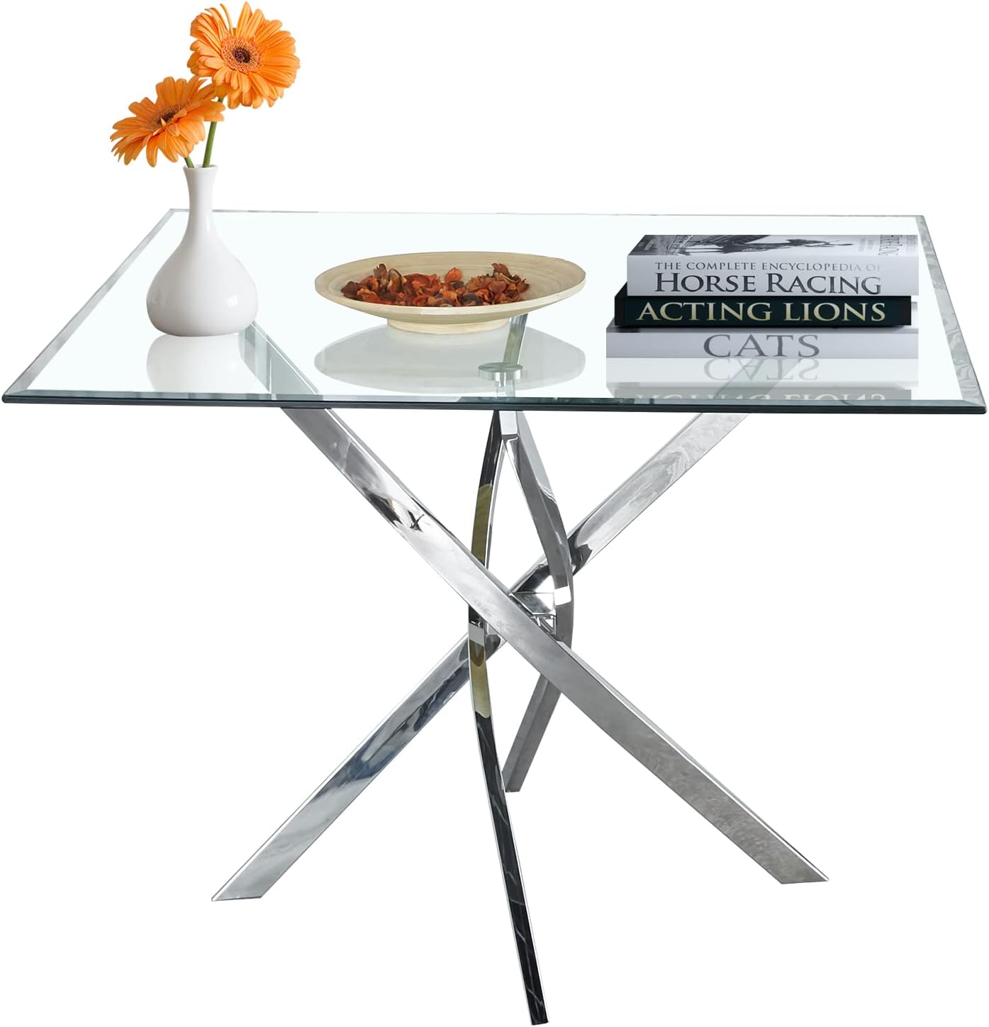 after spending ample time with this sleek glass-topped dining table, we’ve found it to be an excellent fit for compact living spaces. Its sturdy tempered glass surface,measuring 36 inches square,not only provides a clean and modern aesthetic but also withstands heavy use,holding up to 600 pounds without any signs of strain. The polished chrome legs accentuate the contemporary look while ensuring durability and stability, thanks to adjustable foot pads that keep it steady on uneven floors. Assembly was straightforward and quick - just a matter of attaching the legs – making it accessible for anyone who wants to upgrade their dining area with minimal hassle.