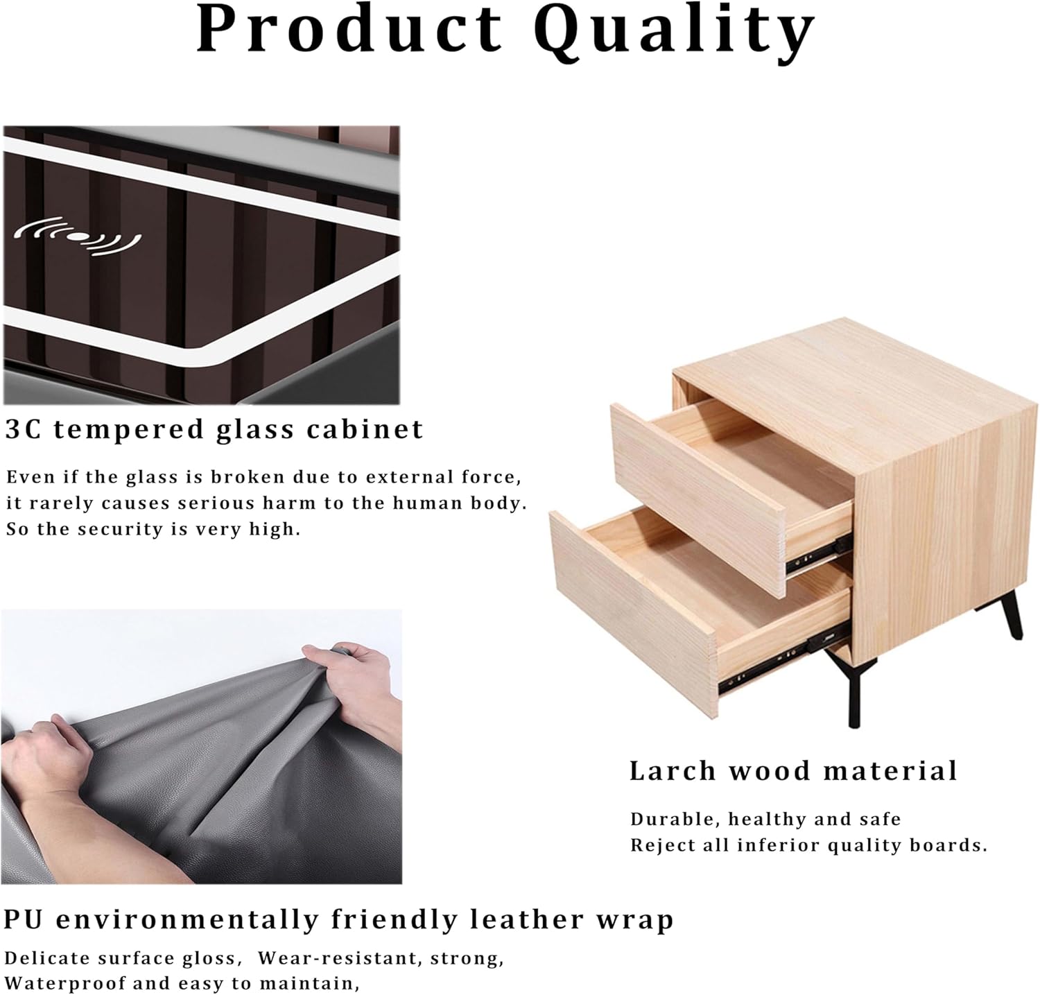 from the moment we started using this smart nightstand, it was clear that durability and craftsmanship were prioritized. The combination of a 3C tempered glass panel, solid wood drawers, and imported microfiber PU leather gives it a sturdy yet elegant feel. The metal brackets add significant reinforcement, ensuring that the structure remains stable even with daily use. Over weeks of testing, the surface has resisted scratches and wear, maintaining its modern look without signs of fading or peeling. The fingerprint lock mechanism remains smooth and responsive, thanks to a self-learning algorithm that adapts effortlessly, underscoring the intelligent design built to last.