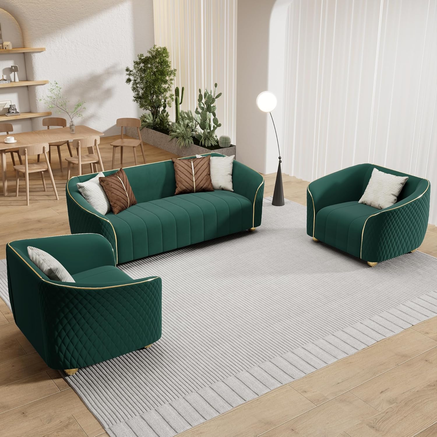 Our living space instantly gains a refined elegance thanks to the seamless blend of mid-century modern elements and luxurious textures in this sofa set. The velvet upholstery offers a soft, inviting feel, while the sleek gold legs add a subtle yet stunning metallic contrast that elevates the overall aesthetic. Available in spacious dimensions-an 85.43″ three-seater paired with two armchairs-this set fits comfortably into a variety of room sizes and layouts without overwhelming the space. The included decorative pillows, each carefully crafted to complement the velvet fabric, add layers of visual interest and extra coziness, transforming your area into a welcoming haven.