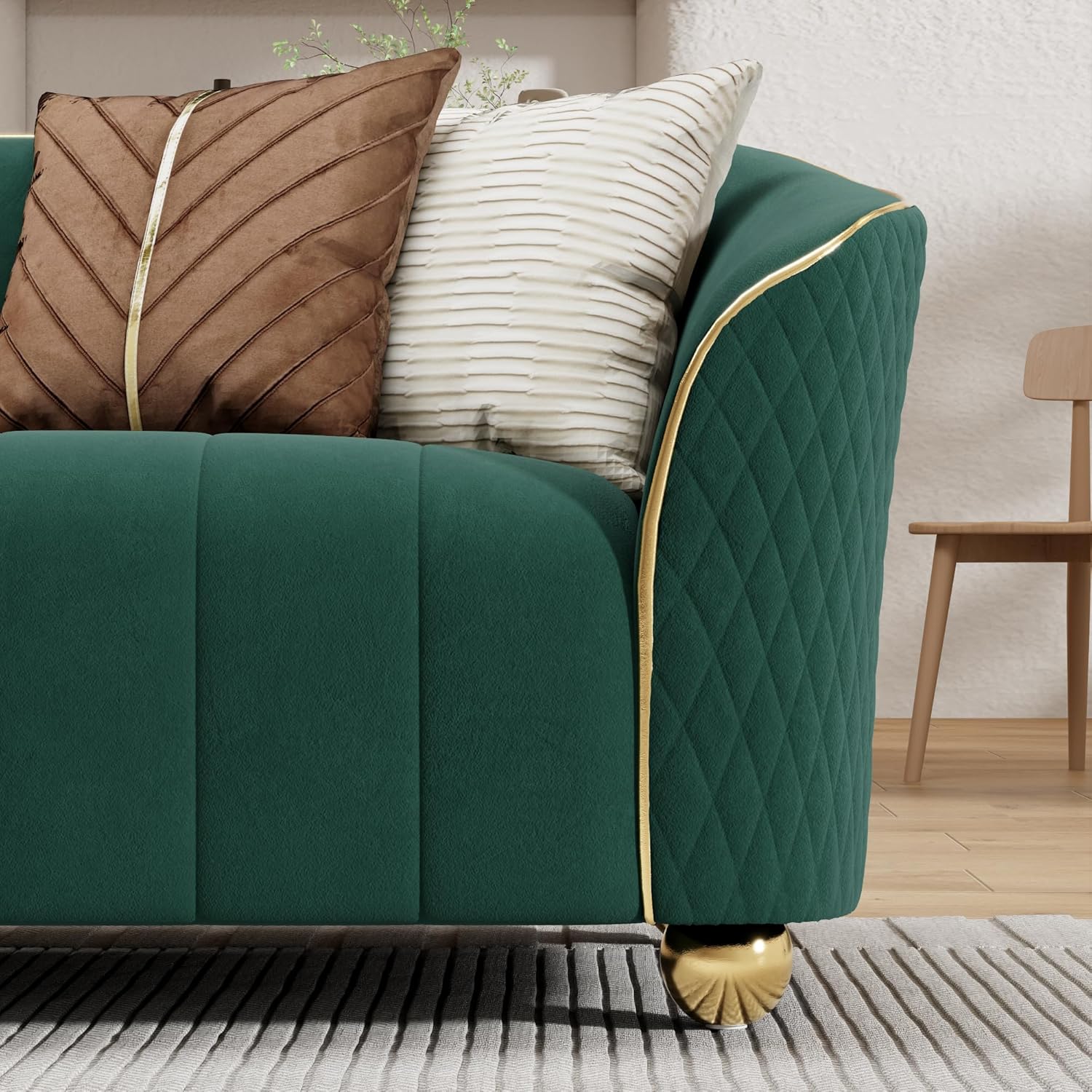 The gold-legged frames are a standout feature, combining sturdy construction with a refined, mid-century modern flair. Crafted to support both the 3-seater and armchair options, these legs measure 3.94 inches in height, providing solid stability while lifting the sofa set just enough to protect your floors from scratches and scuffs. The metal used feels robust and well-finished, giving us confidence that these frames will hold up well against everyday use, from casual lounging to entertaining guests. Plus, their sleek gold finish adds a touch of elegance that complements the rich velvet upholstery without overpowering the overall design.