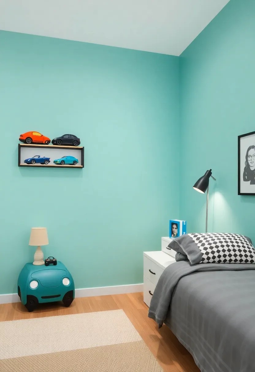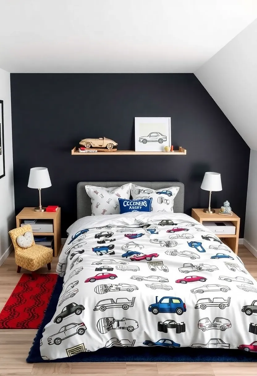 Additionally,implement color schemes and patterns that resonate with the automotive theme while ensuring the room remains a calming environment. Use bold accent walls in shades of racing red or sleek black, paired with neutral tones to create a harmonious look. Choose textured fabrics like leather for cushions and blankets to mimic a car interior, thereby enhancing the visually appealing design. To tie the room together, consider the installation of unique lighting fixtures such as pendant lights shaped like gears or vintage car lamps. Each element should work in unison to create a space that fuels his passion for cars yet remains practical for everyday use.