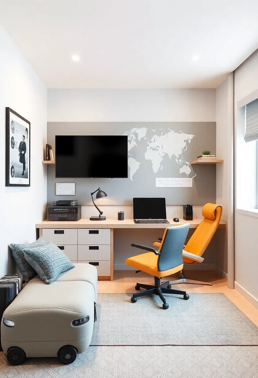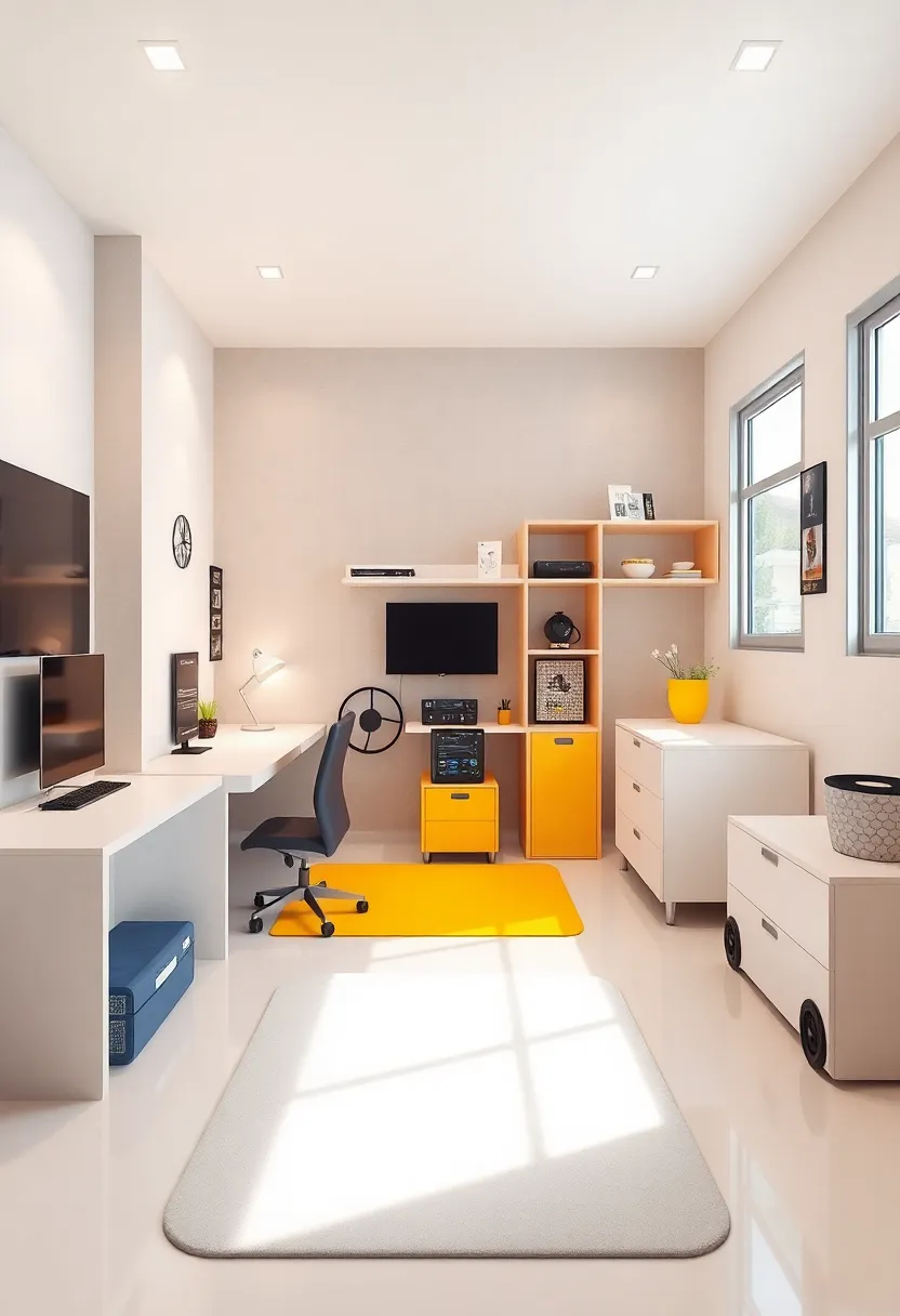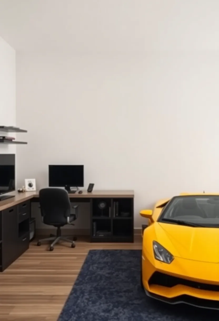 To further enhance the space, consider incorporating smart storage solutions that reflect the automotive vibe. Use crates styled like car tires or shelves shaped like garage tools to keep essentials organized while staying on theme.Adding a comfortable chair that mimics a racing seat will not only emphasize the automotive edge but also ensure long hours of studying remain enjoyable. Take the design a step further by painting the walls a striking shade reminiscent of a vibrant garage or using decals that mimic racing stripes, establishing a perfect backdrop for a multifunctional area that excites and fuels learning.
