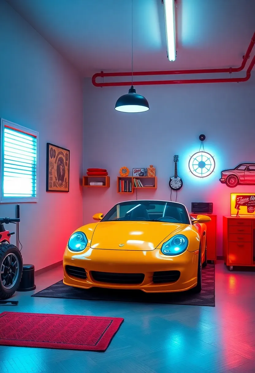 Combining these elements not only sets the right mood but also creates a layered lighting experience, making the room feel inviting while showcasing the love for automobiles. Mesh the bright, energetic vibes of LED strips with the grounding presence of vintage lamps for a well-rounded and aesthetically pleasing design.