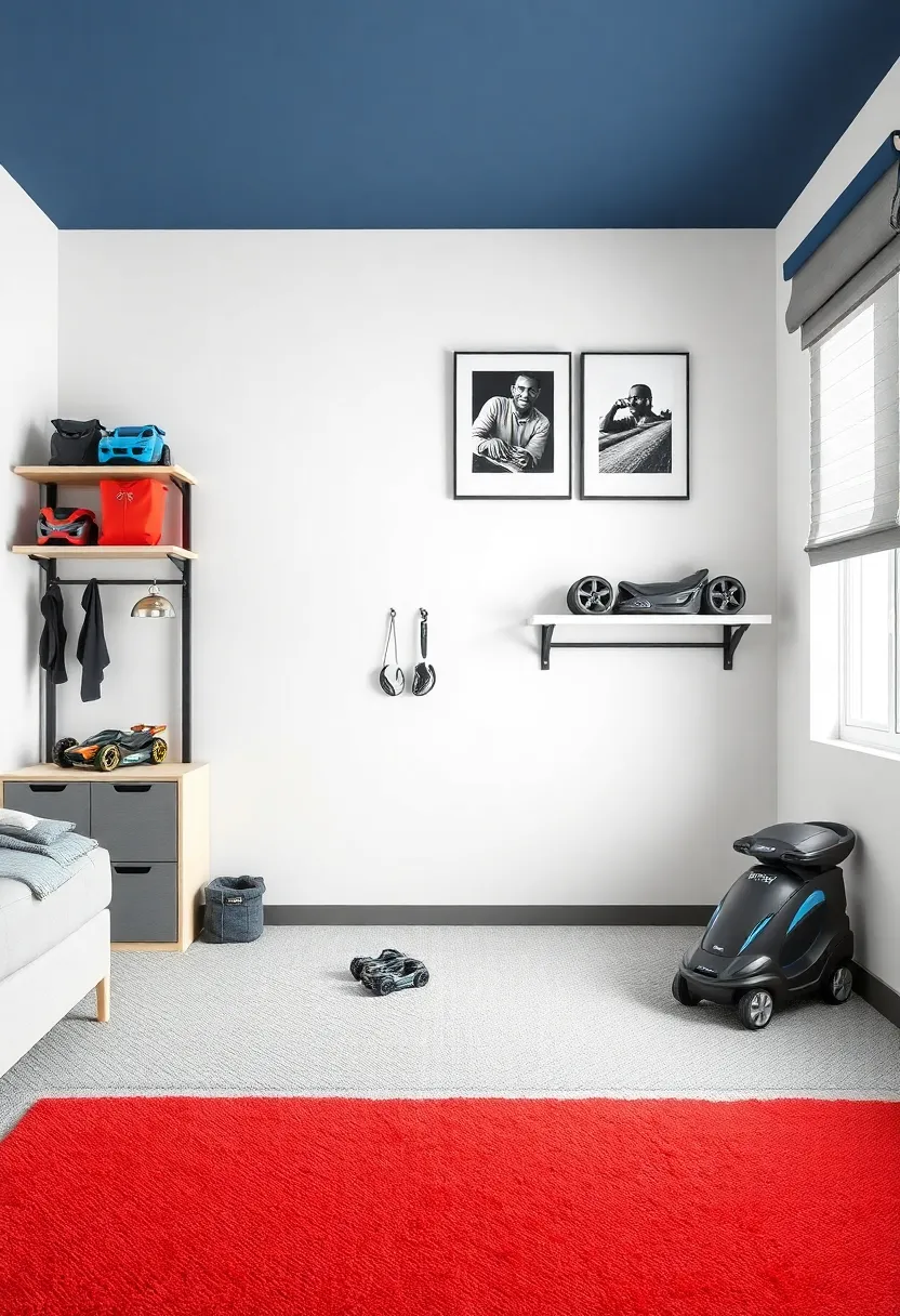 To optimize vertical space, think about wall-mounted organizers that mimic car parts or racing memorabilia. Options such as tire racks or open shelving styled after workbenches can provide a unique look while being incredibly practical. For a touch of sophistication, use custom bins or boxes with chrome finishes or sport-themed decals, giving the room a polished yet playful vibe. Below is a table showcasing versatile storage ideas that blend seamlessly with the car-themed decor: