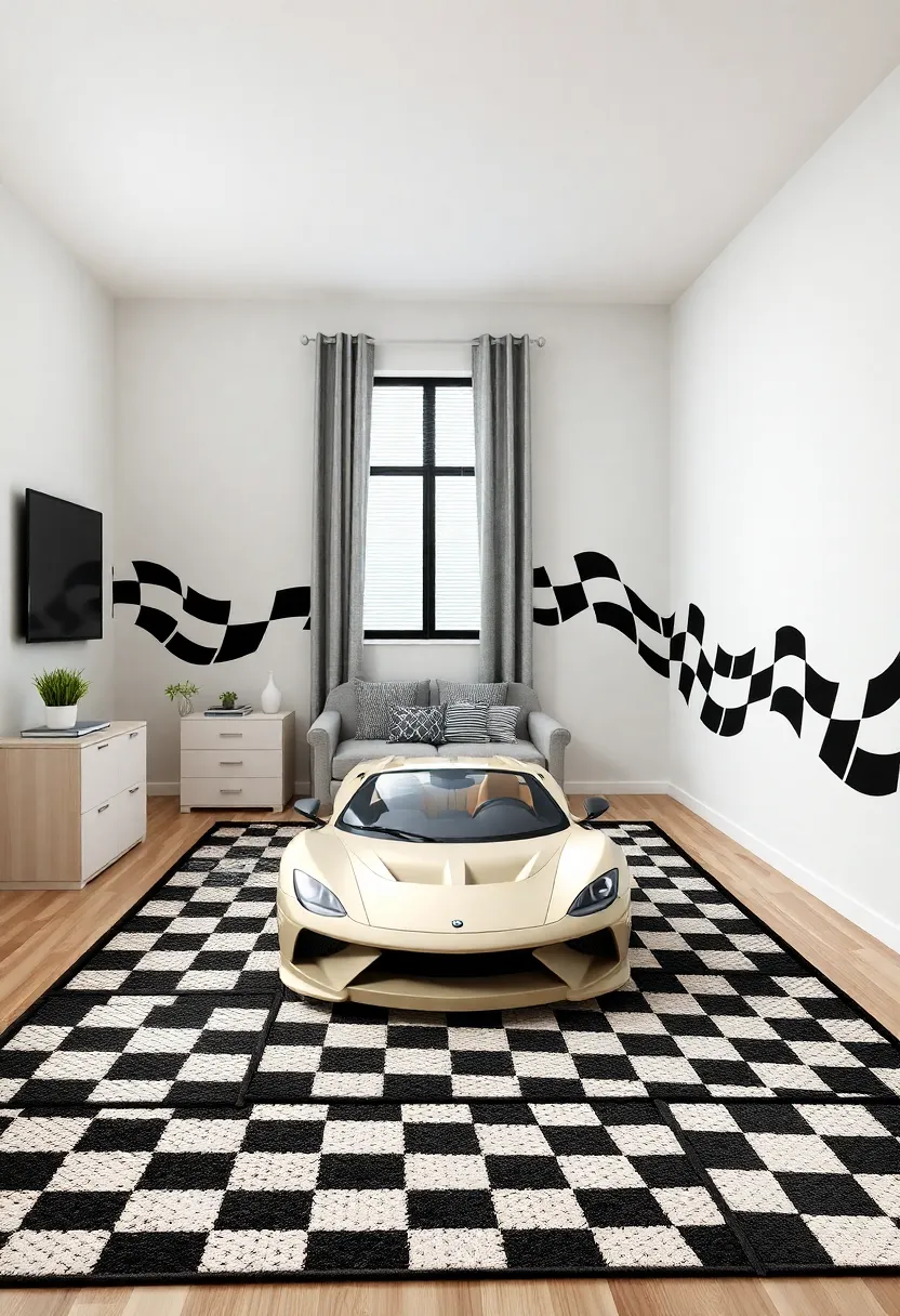 - Textiles: Include bedding and curtains with patterns mimicking racing stripes or automotive motifs.