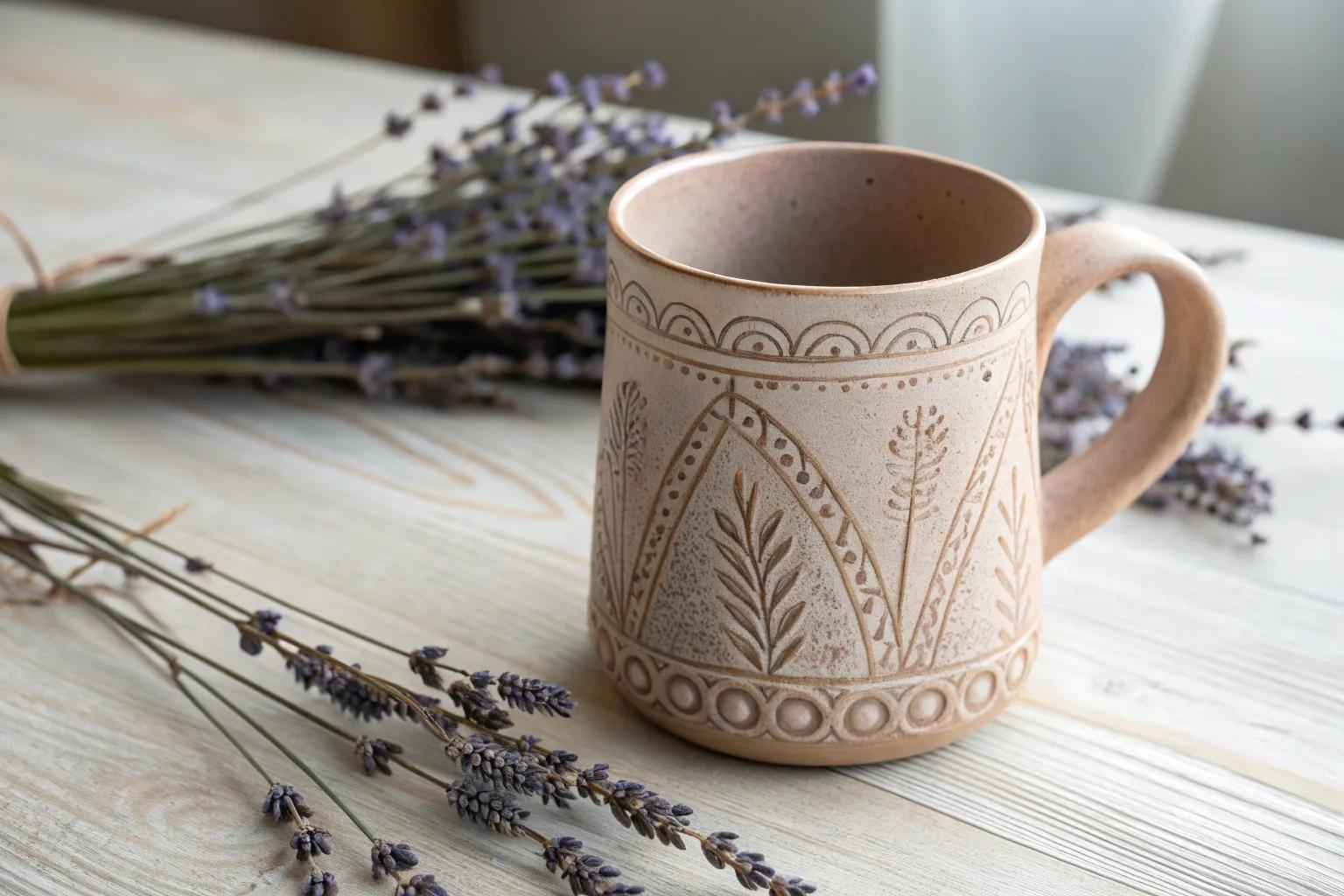 Elevate your mug-making by experimenting with textured patterns that engage both sight and touch. Floral embossments or geometric reliefs add sophistication and a sensory dimension to your pottery.