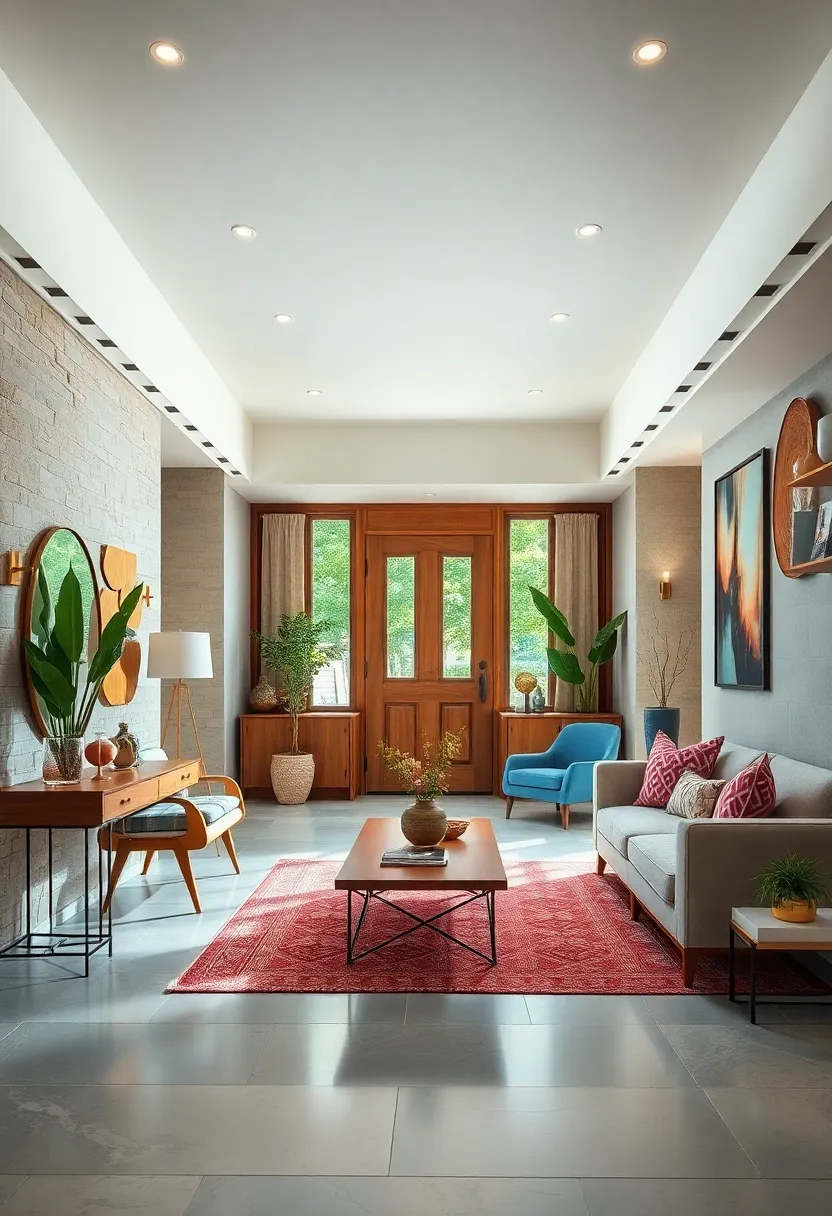 Combining subtle, neutral tones with bold, abstract color blocking creates an engaging visual dialogue that elevates any entryway.The juxtaposition of soft beige walls or cool grays against vibrant geometric shapes infuses the space with personality without overwhelming its serene ambiance. This design strategy allows the eyes to flow naturally across the room, creating a balanced yet lively welcome that reflects the essence of mid-century modern aesthetics.