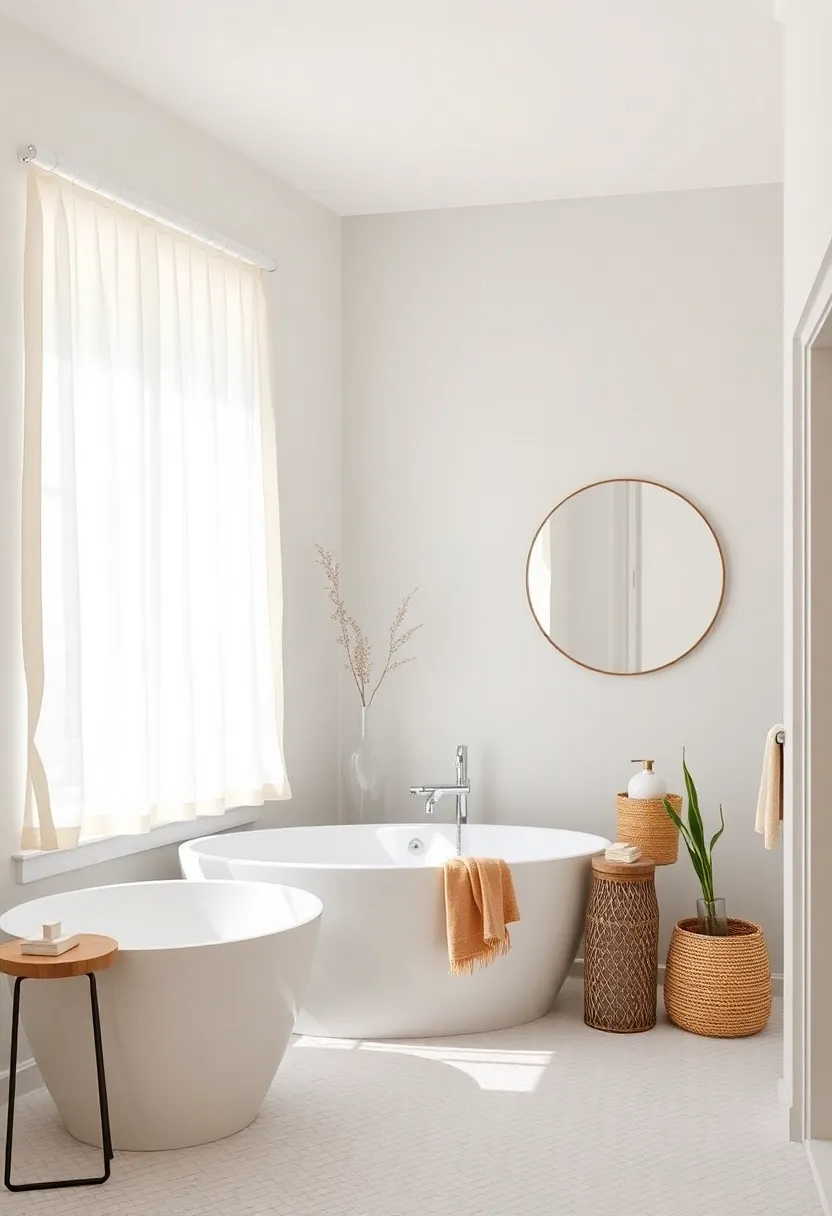 For a striking focal point, choose oversized wall art that resonates with earthy tones and ethereal patterns. Look for pieces that reflect natural themes, like landscapes or abstracts in soft hues. Additionally, floating shelves adorned with unique trinkets and small succulents can bring visual interest to bare walls, allowing for personalization while maintaining an airy feel. To complete the look, add a wooden mirror with intricate detailing; it not only enhances the space but also plays with light, making the bathroom feel more expansive. For more stunning decor ideas, check out Architectural Digest.