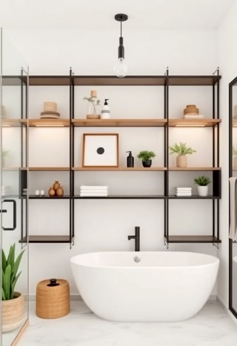 Integrating colorful bins or baskets into your shelving can help organize toiletries and bath necessities without sacrificing style. Choose materials that echo your overall decor, such as macramé or rattan, and arrange them in a visually pleasing manner. Also, consider using a combination of open and closed shelving to maintain a tidy appearance while allowing the display of curated decor. A table showcasing various shelving styles could help you visualize the options: