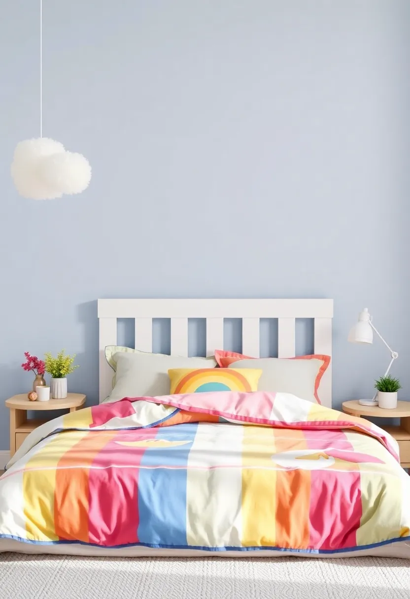 To complement the playful ambiance, consider adding touches that echo the enchanting theme throughout the room.Select bedding that features soft pastels and bold hues, harmonizing perfectly with the backdrop of whimsical rainbows. Here are some creative ideas to enhance the overall experience: