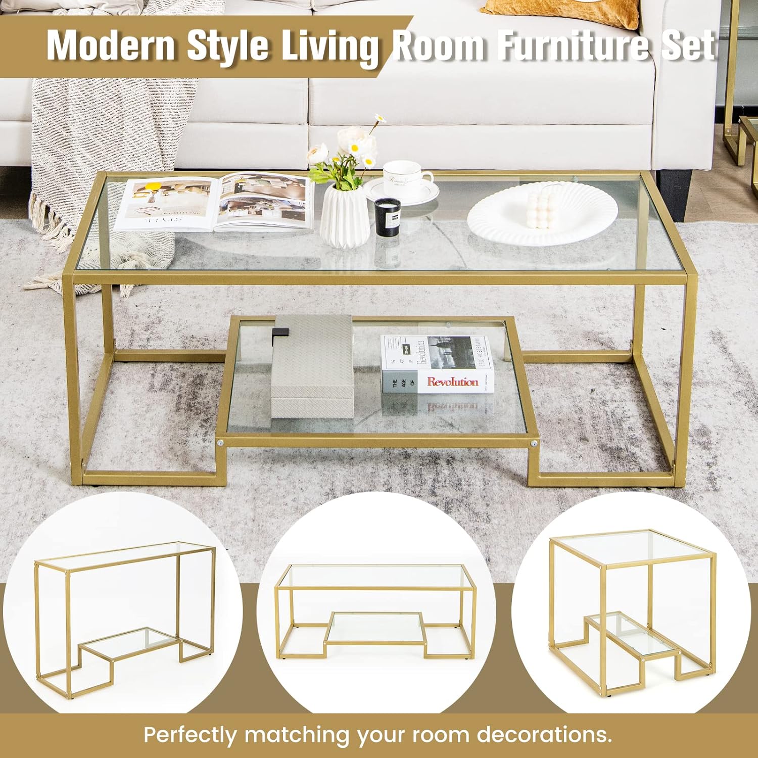 Integrating this coffee table into our living room immediately elevated the space with its sleek, modern vibe. The two-tier design provides more than just aesthetic appeal - it offers practical storage that helps us keep clutter at bay. The large,tempered glass surface accommodates coffee mugs,decorative vases,and even our laptops during work-from-home sessions. simultaneously occurring, the lower tier is perfect for storing magazines and small essentials, keeping the top clear and visually airy. The golden steel frame adds a subtle touch of luxury without overwhelming the room’s decor,complementing both neutral palettes and bold accents alike.