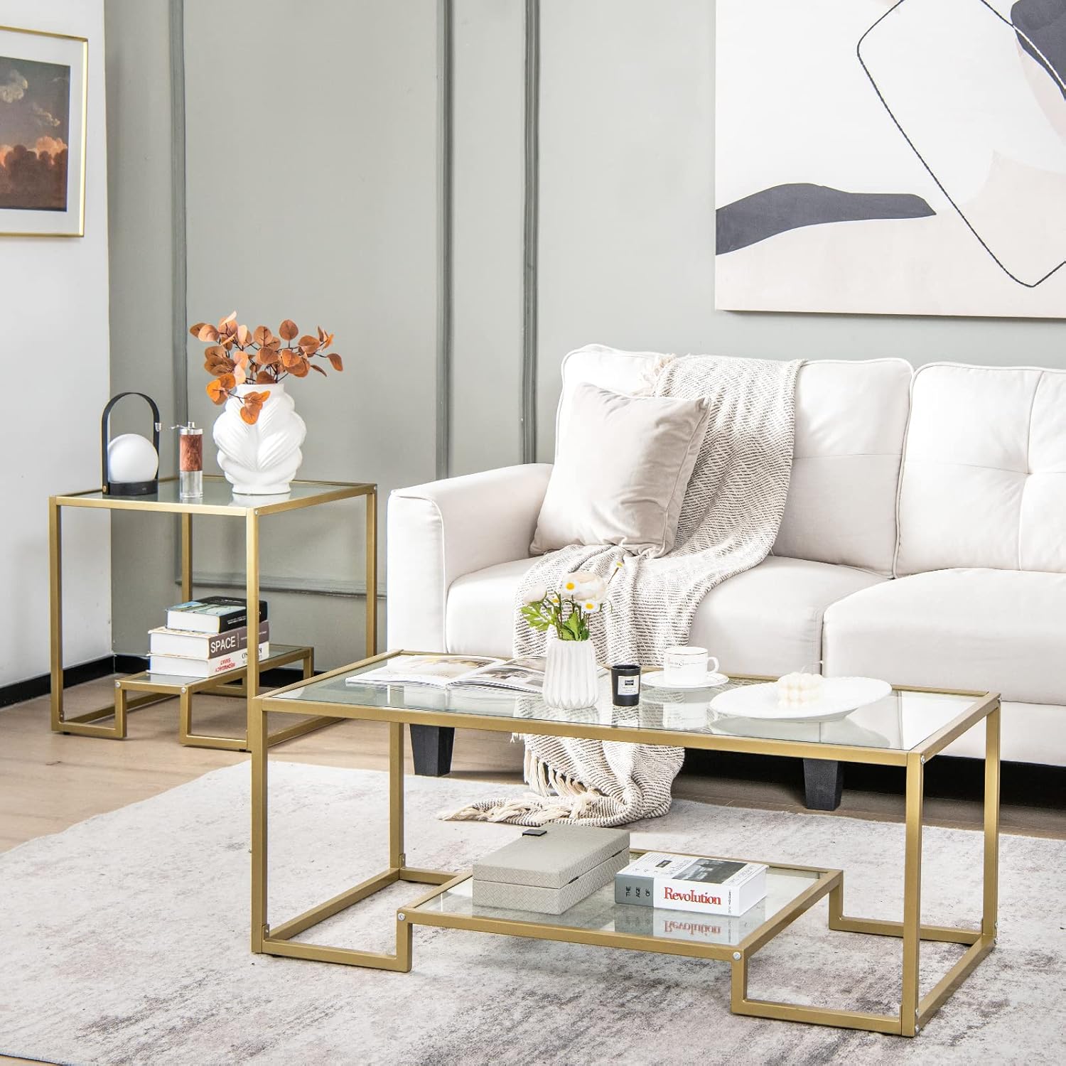 Functionality is seamlessly combined with style here. The generous width provides ample space for coffee cups, laptops, or decorative accents, while the second tier offers thoughtful storage for magazines and everyday items, helping to keep our living room clutter-free. Additionally, the sturdy golden steel frame and adjustable foot pads stabilize the structure on uneven floors and protect our floors from scratches-maintaining both style and practicality.