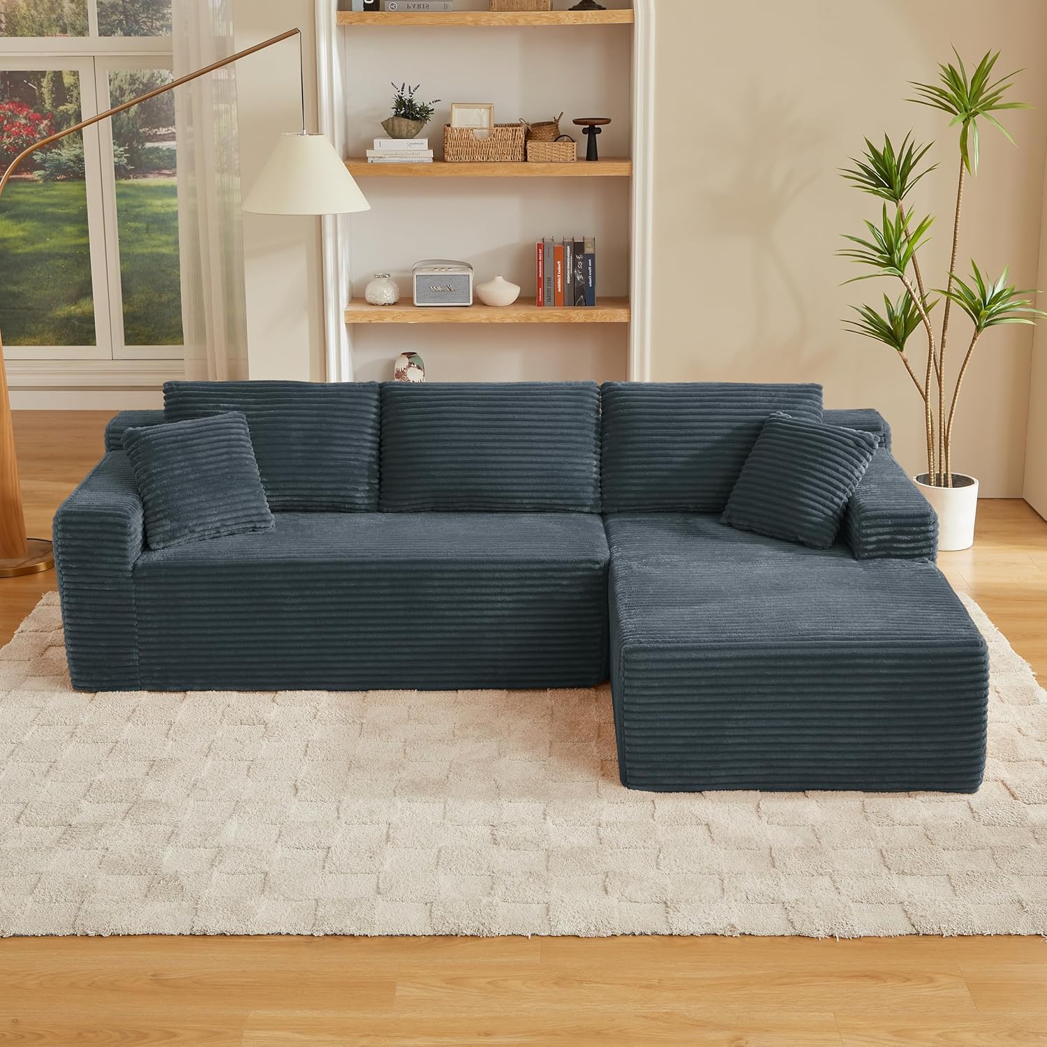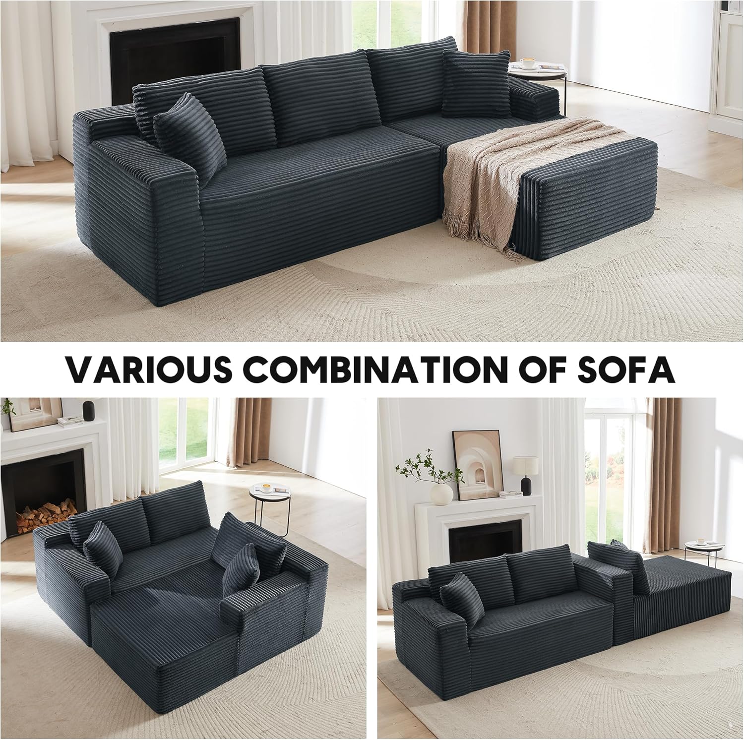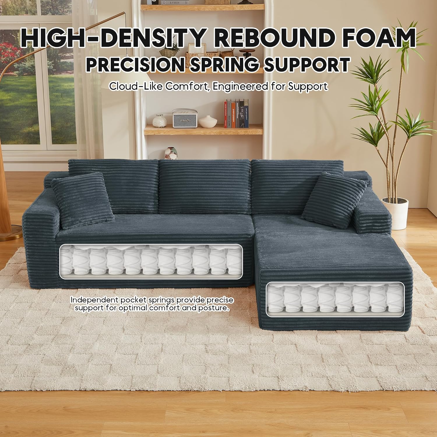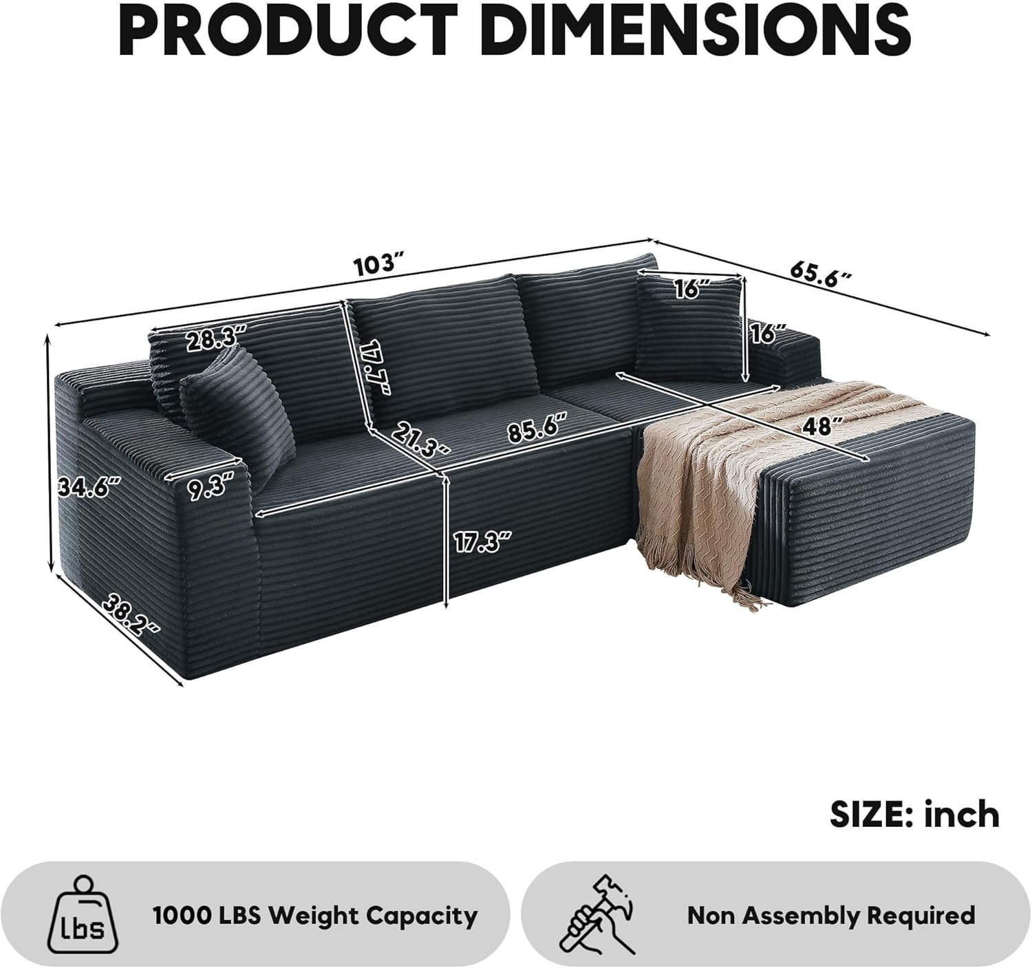 From the moment we unboxed this sectional, its inviting presence was unmistakable. Wrapped in luxuriously soft corduroy fabric, the texture immediately added a warm and stylish element to our living room. The dark gray hue complemented various décor styles effortlessly, while the subtle sheen of the corduroy enhanced the overall aesthetic without feeling overwhelming.Its modular design arrived fully assembled, allowing us to position it with ease right out of the box. The right-facing L-shaped chaise offers ample space for lounging, with a deep 48-inch seat that provides cloud-like comfort, thanks to premium high-resilience foam and coil spring construction beneath the upholstery.