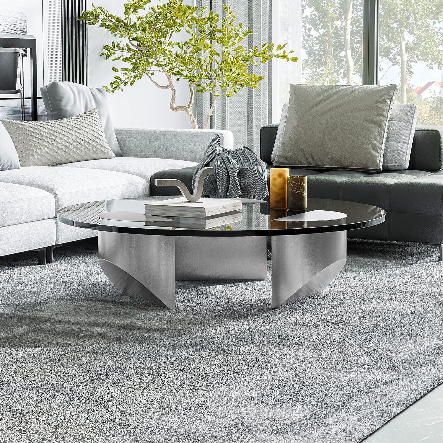Supporting this sturdy glass top are three semi-circular steel legs arranged in a perfect triad, spaced 120 degrees apart for maximum balance and stability. The brushed finish on these legs adds a subtle industrial flair while their clever design - cut at a 30-degree diagonal – seems to lift the entire table delicately off the ground. This means the table is both visually light and structurally sound, showing that thoughtfulness in design can achieve an elegant yet durable piece for our living or office space.