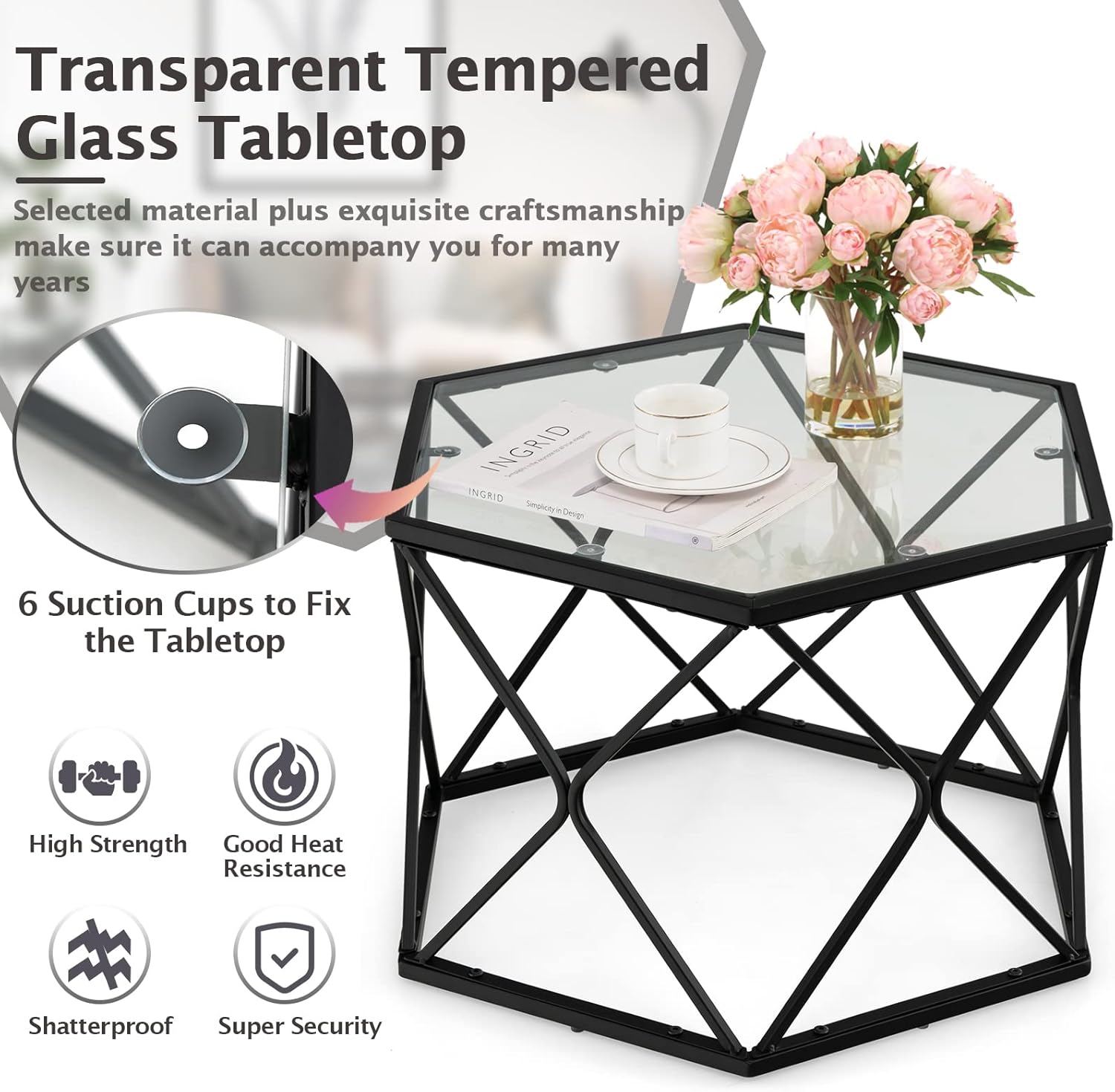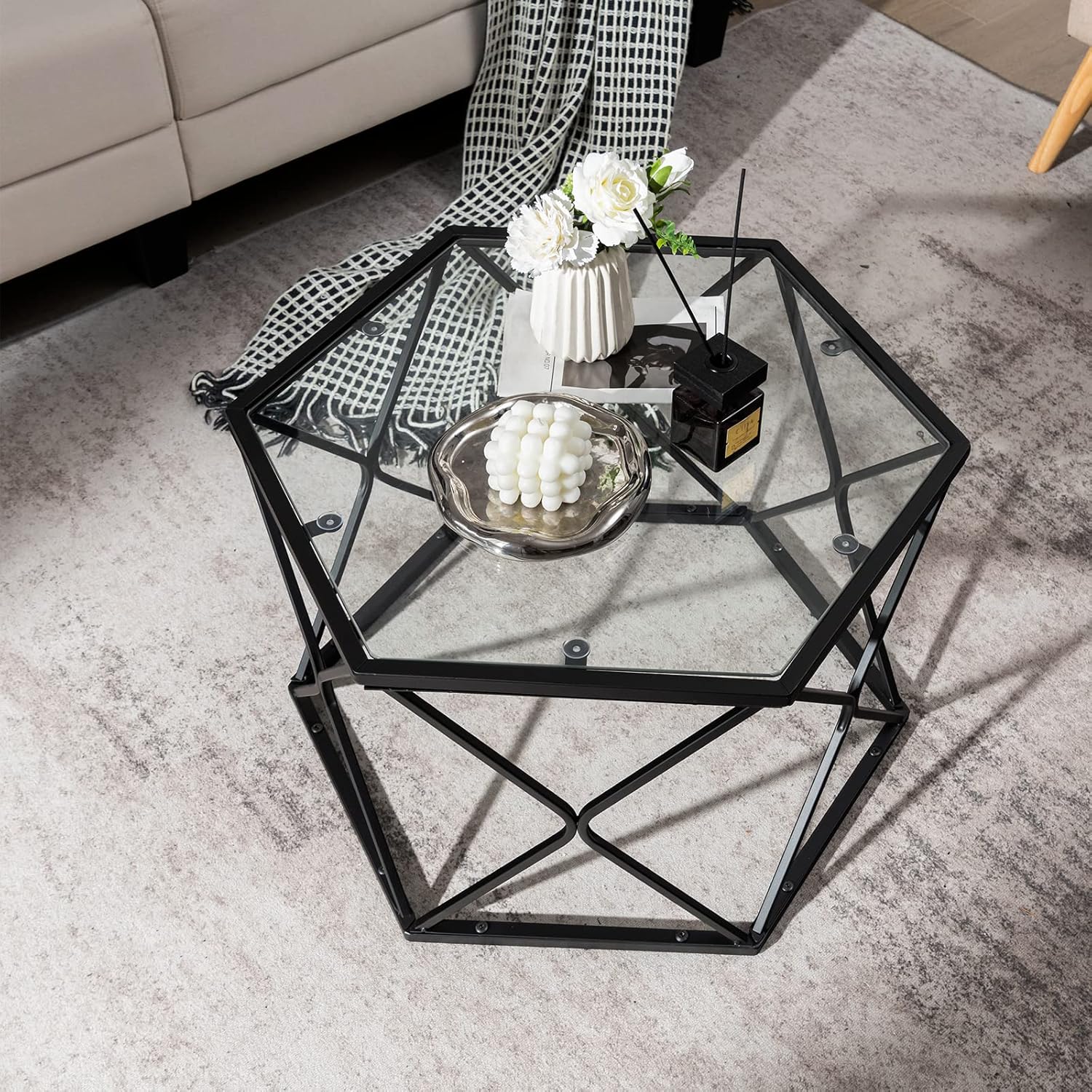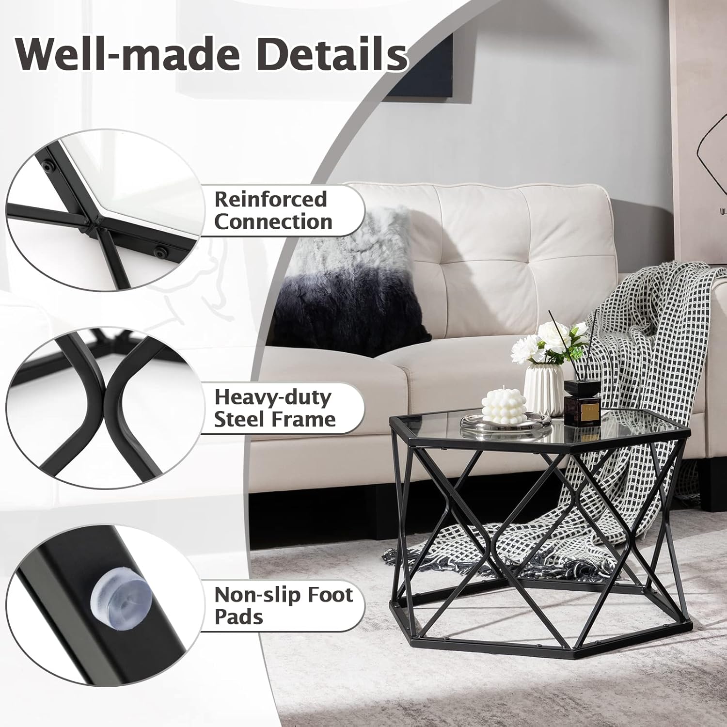 one of the standout features of this piece is its unique geometric hexagonal design, which adds a modern flair without overwhelming the space.the blend of the tempered glass top with the sleek black steel frame strikes a perfect balance between minimalist elegance and sturdy functionality. This combination allows the table to complement a wide variety of interior styles, from contemporary lofts to cozy, eclectic living rooms.Its subtle yet striking profile makes it a versatile choice that enhances without competing with other décor elements.