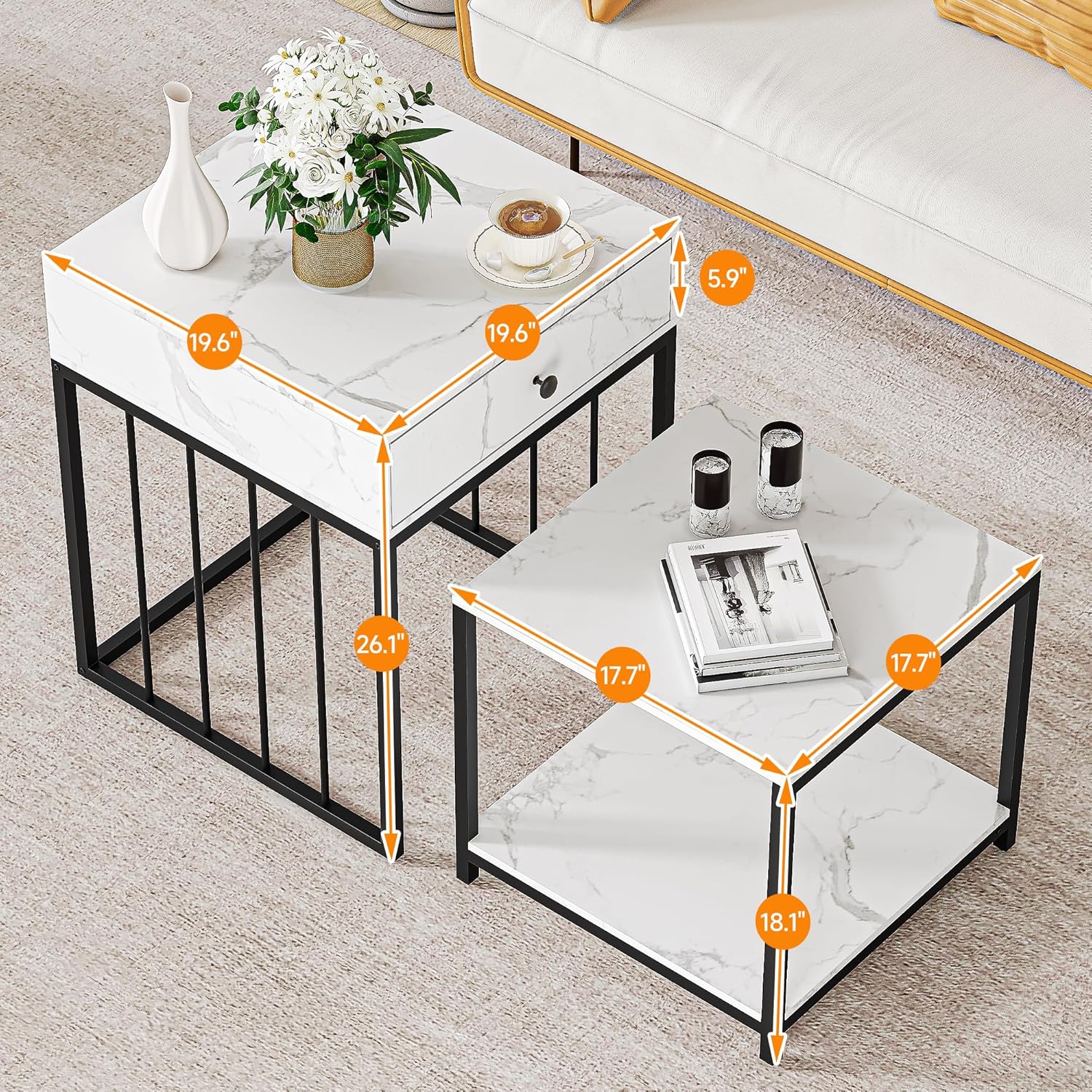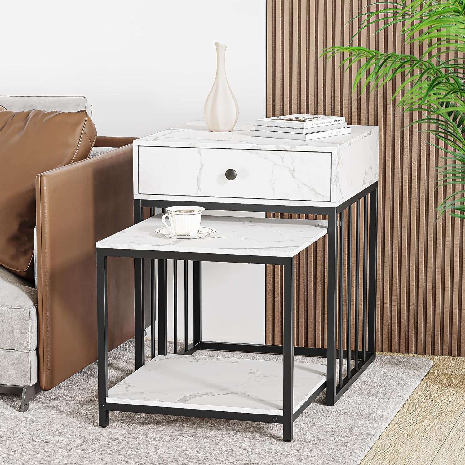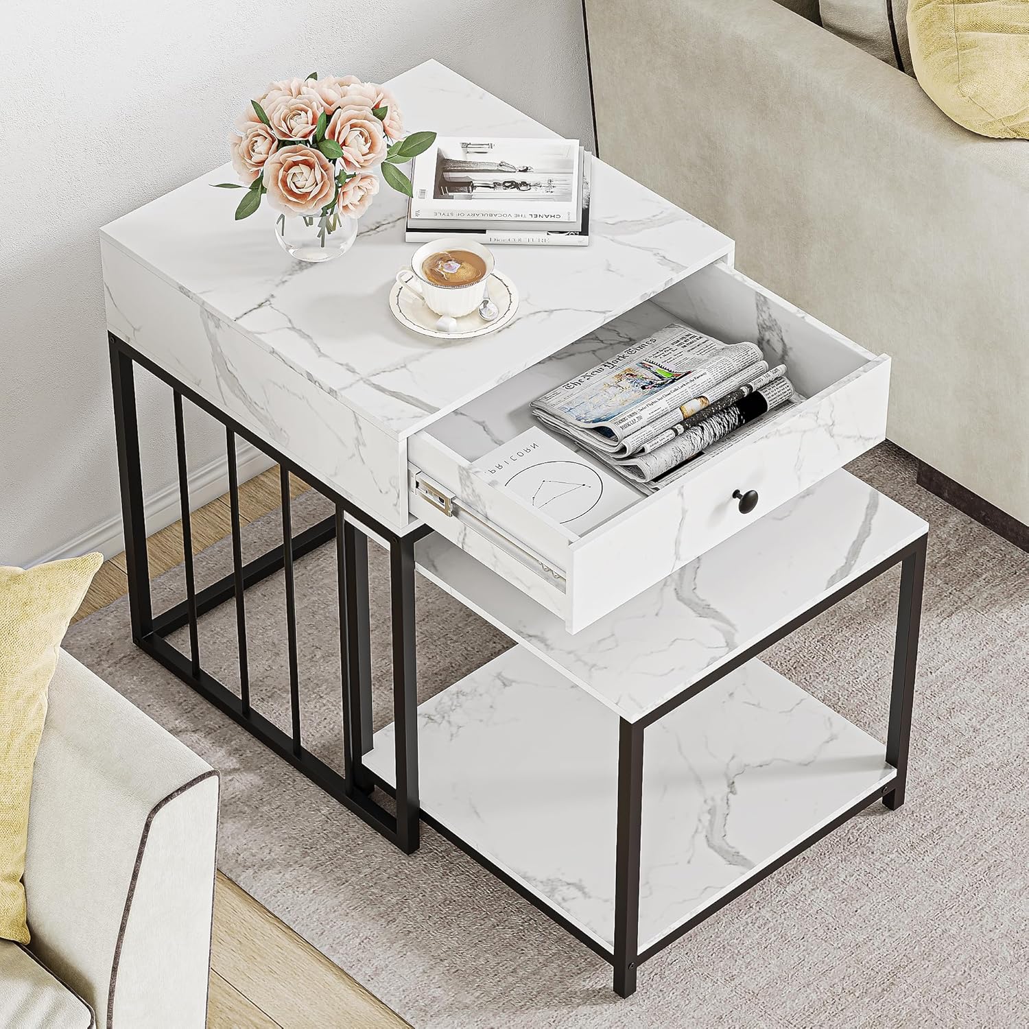 One of the standout features of this table is its remarkable adaptability. Whether nestled beside the bed as a stylish nightstand or positioned on a sunny balcony holding your morning coffee, it fits effortlessly.Its compact size is especially beneficial for those of us living in apartments or rooms where every inch counts.Thanks to the smooth-gliding drawer and two-tier shelf, the table provides practical storage without overwhelming the space, keeping essentials organized and within reach. The elegant marble grain finish further ensures it complements a range of decor styles, from cozy bedrooms to modern outdoor nooks.