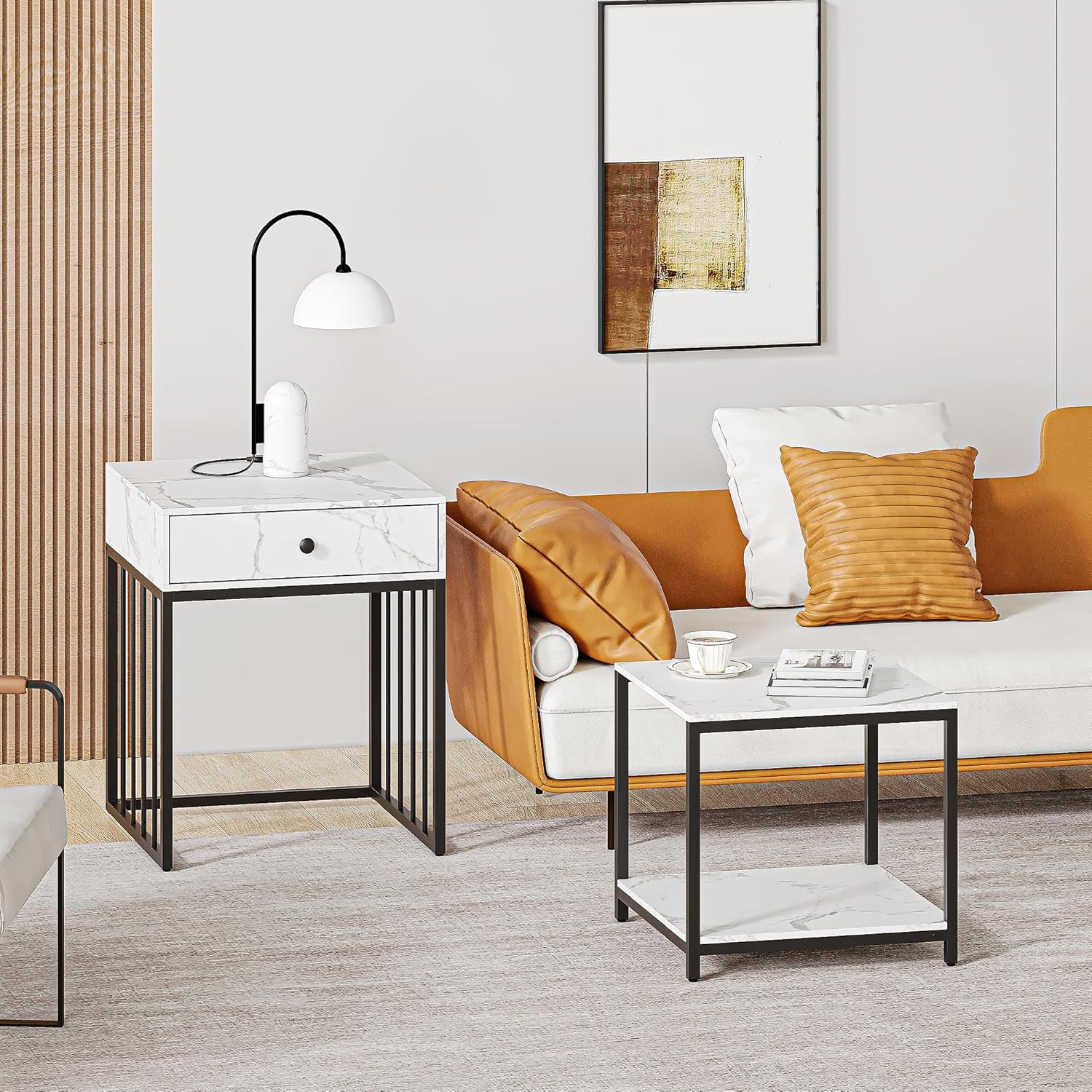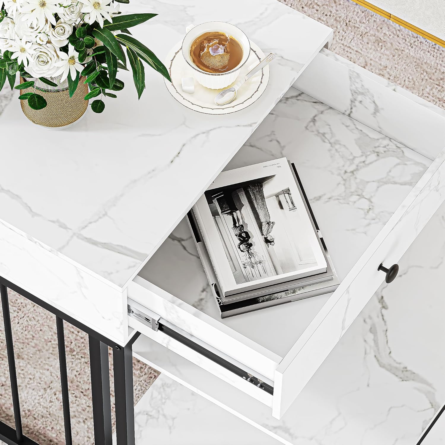 After spending considerable time with this modern coffee table, we appreciate how well it combines style and practicality, making it a versatile addition to various spaces in your home. The marble grain finish lends an elegant touch that easily complements contemporary and minimalist interiors, while its compact size ensures it fits comfortably in small rooms, balconies, or bedrooms without overwhelming the area. What stands out most is the thoughtful storage options – a smooth-gliding drawer accompanied by two tier shelves – which help keep essentials like remotes, magazines, and coasters perfectly organized and within reach.