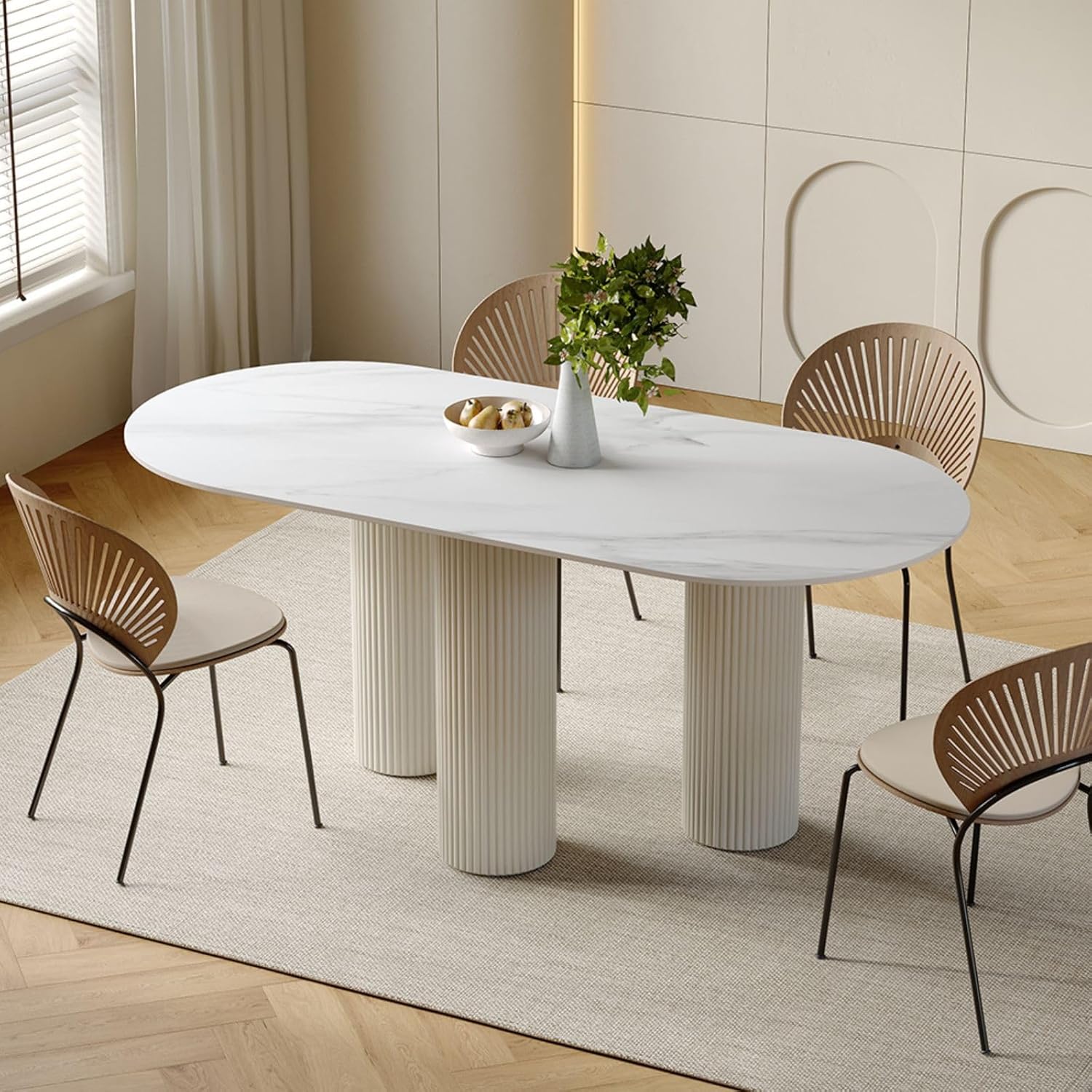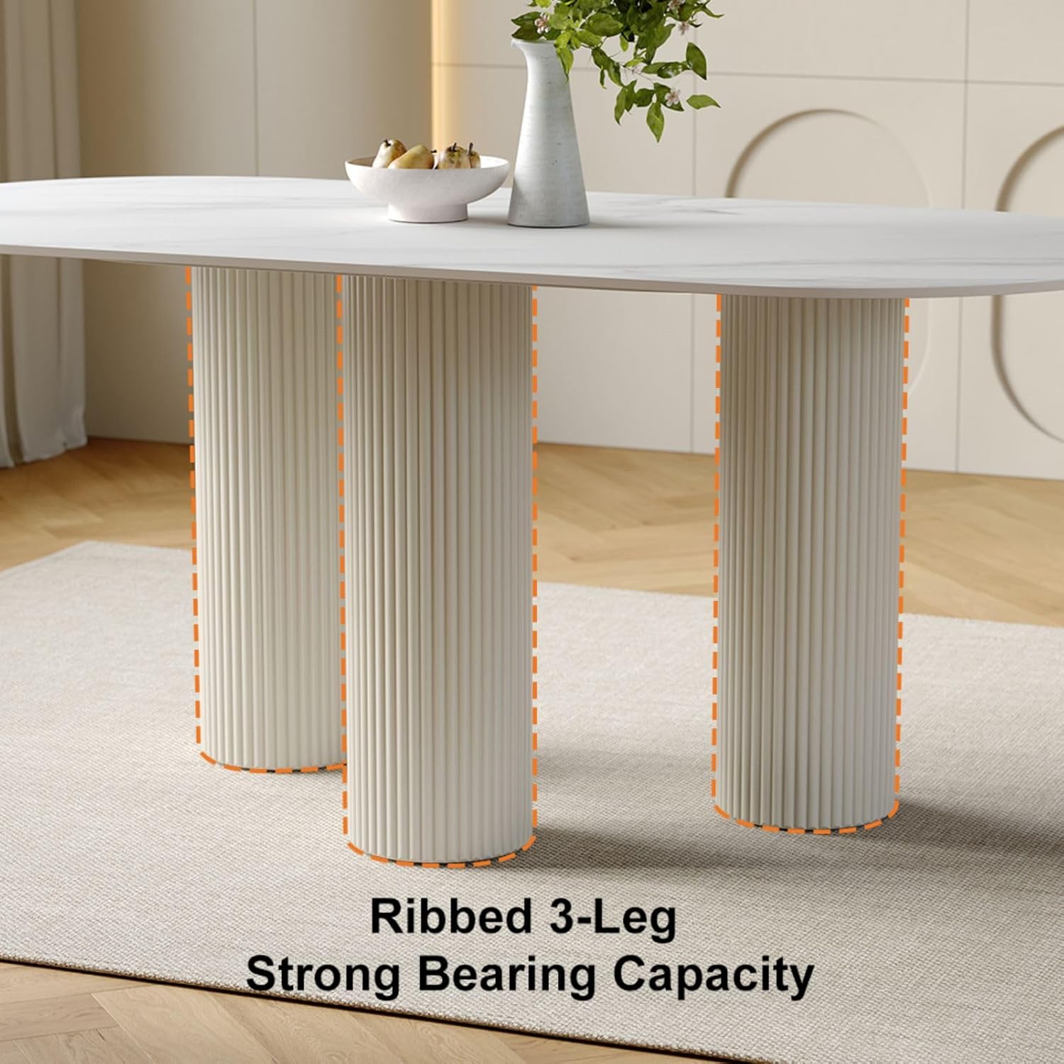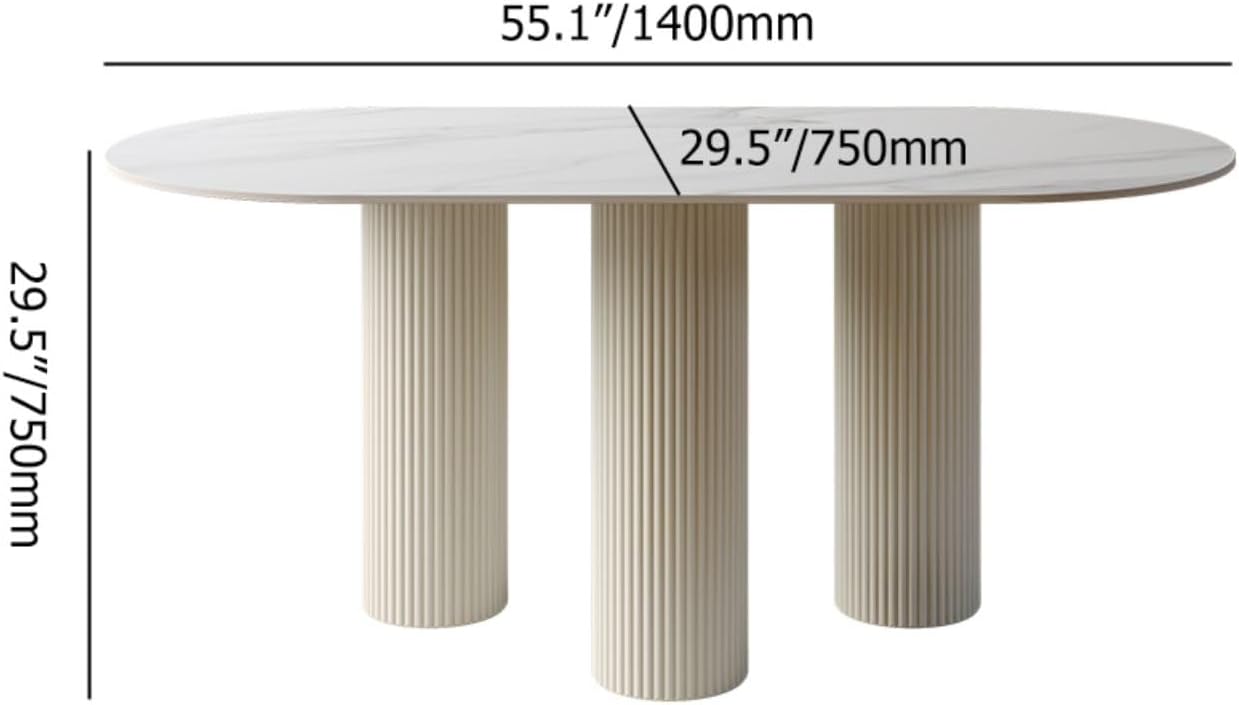 Its elegant oval shape and compact dimensions make this table a versatile addition to both cozy kitchens and more spacious dining rooms.Measuring 55.1″ long and 29.5″ wide, it effortlessly accommodates 4-6 people without overpowering the room. The smooth, sintered stone surface paired with a minimalist white finish integrates well with a range of interior styles-from modern mid-century to Japandi-inspired designs.The unique three-legged base enhances stability while contributing an artistic flair, allowing the table to become a subtle focal point in your dining area without cluttering the visual space.