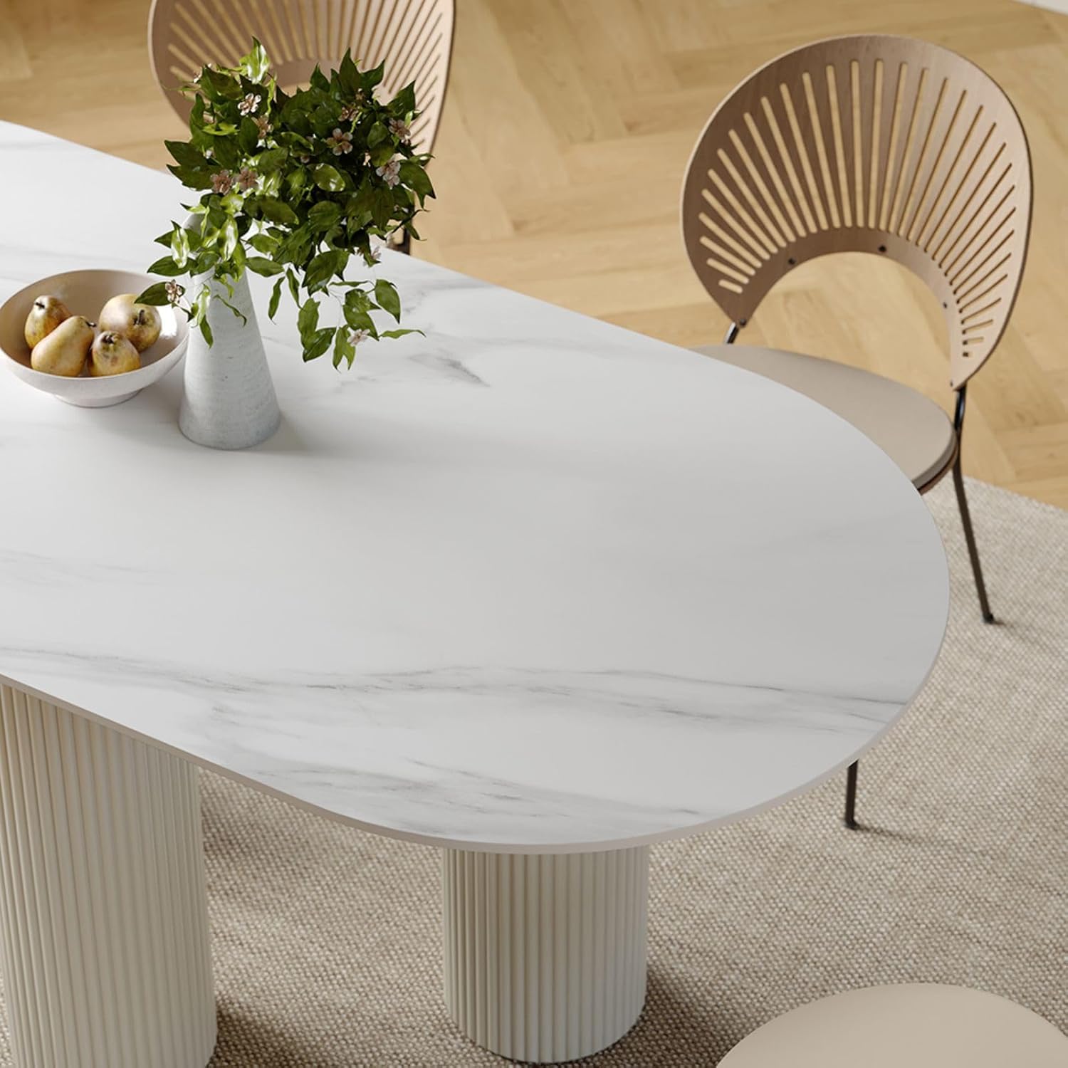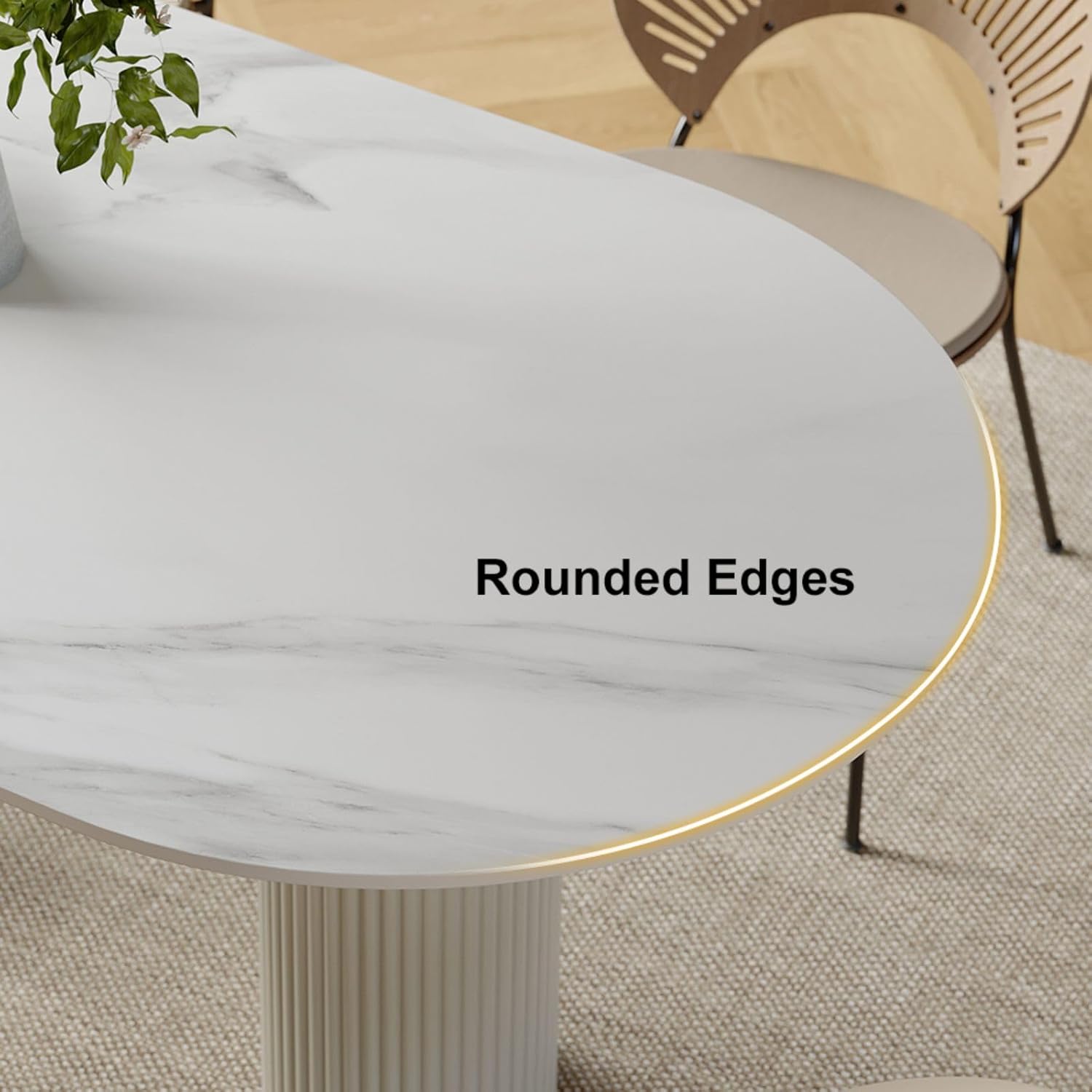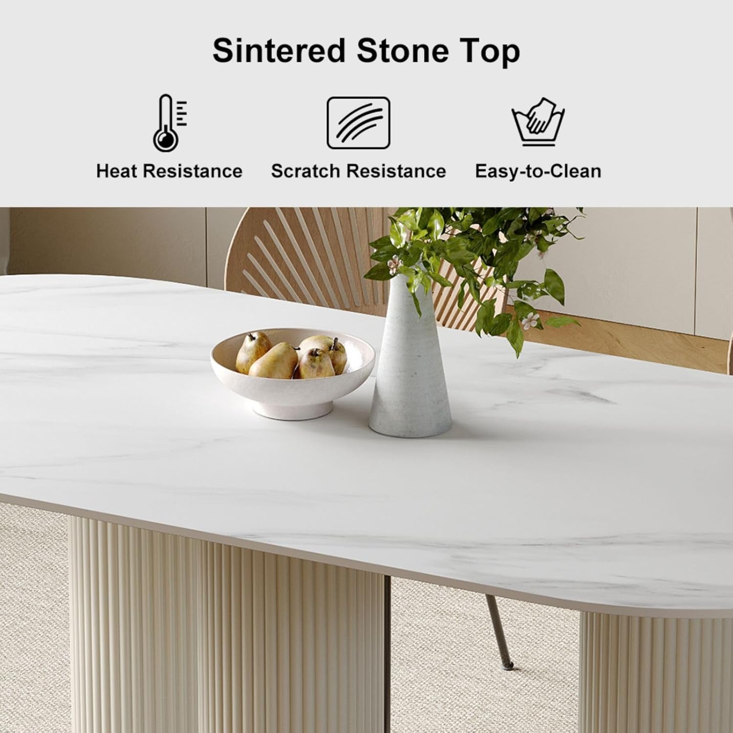 Its elegant oval shape and compact dimensions make this table a versatile addition to both cozy kitchens and more spacious dining rooms.Measuring 55.1″ long and 29.5″ wide, it effortlessly accommodates 4-6 people without overpowering the room. The smooth, sintered stone surface paired with a minimalist white finish integrates well with a range of interior styles-from modern mid-century to Japandi-inspired designs.The unique three-legged base enhances stability while contributing an artistic flair, allowing the table to become a subtle focal point in your dining area without cluttering the visual space.